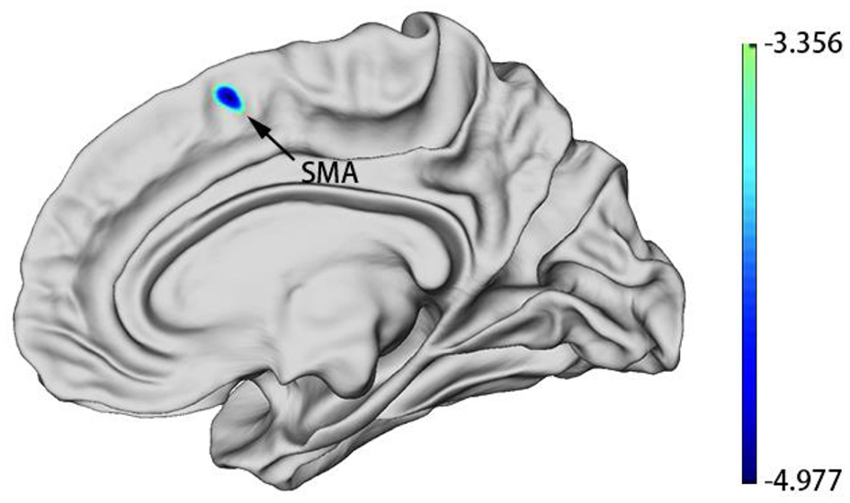 MDD group patients showed decreased cortical thickness of SMA in the right hemisphere at baseline. Blue regions represent areas of decreased cortical thickness.