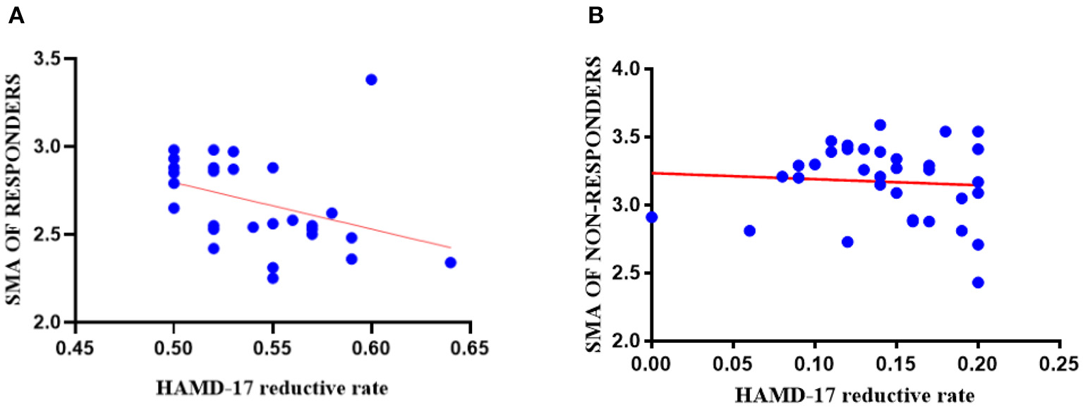 Post-hoc analysis, two-tailed Pearson partial correlation analysis controlling for age, gender, and education was performed for the responder group and the non-responder group separately. As shown in Figure 4, there was a negative correlation between the HAMD-17 reductive rate (2 weeks) and the cortical thickness of right SMA at baseline in the responder group (r = −0.373, p = 0.044), but there was no significant statistical difference in the correlation analysis of the non-responder group (r = −0.072, p = 0.550).
