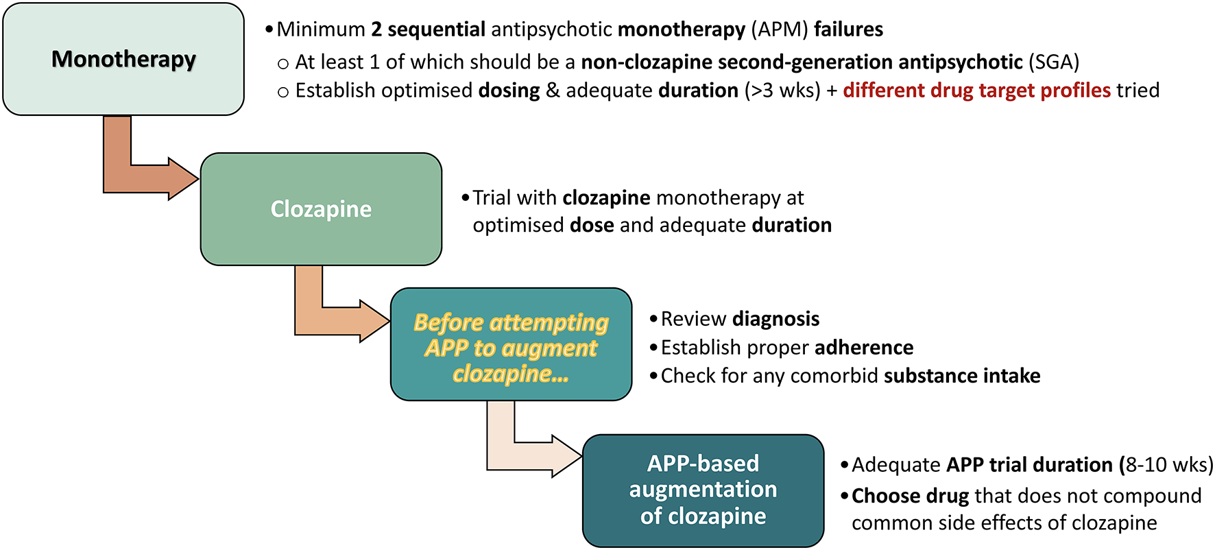 When antipsychotic drug monotherapy responding is an issue—be it for efficacy, AE/tolerability, safety, adherence, and/or other reasons—the treating physician is faced with a number of options and decisions. These may include to adjust the dose, to switch to another antipsychotic agent, and/or to consider augmentation approaches. Irrespective of which tactic is ultimately selected, apart from other clinically-based reflections there are some common basic aspects that require consideration in this situation: