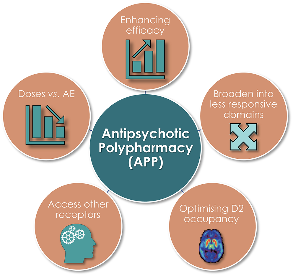 A variety of reasons for instigating APP have been given. These include general desires to enhance, broaden, and sustain treatment efficacy—but also to attenuate adverse events (AE; e.g., weight gain, metabolic issues, and prolactin rise) and as a preventive measure vs. relapse and rehospitalization—relative to the outcome from APM alone. The aforementioned ambitions apply in particular concerning the management of negative and cognitive symptoms, in patients with greater illness severity and complexity, longer duration of illness and hospitalization, and treatment refractoriness (1, 6, 7). Other associations of APP, e.g., with younger age and male sex may stem from more severe (negative) symptoms already at early age in males than in females (7). Observed variations across geographies possibly reflect an impact of local therapy tradition and inherited prescriptions (1).