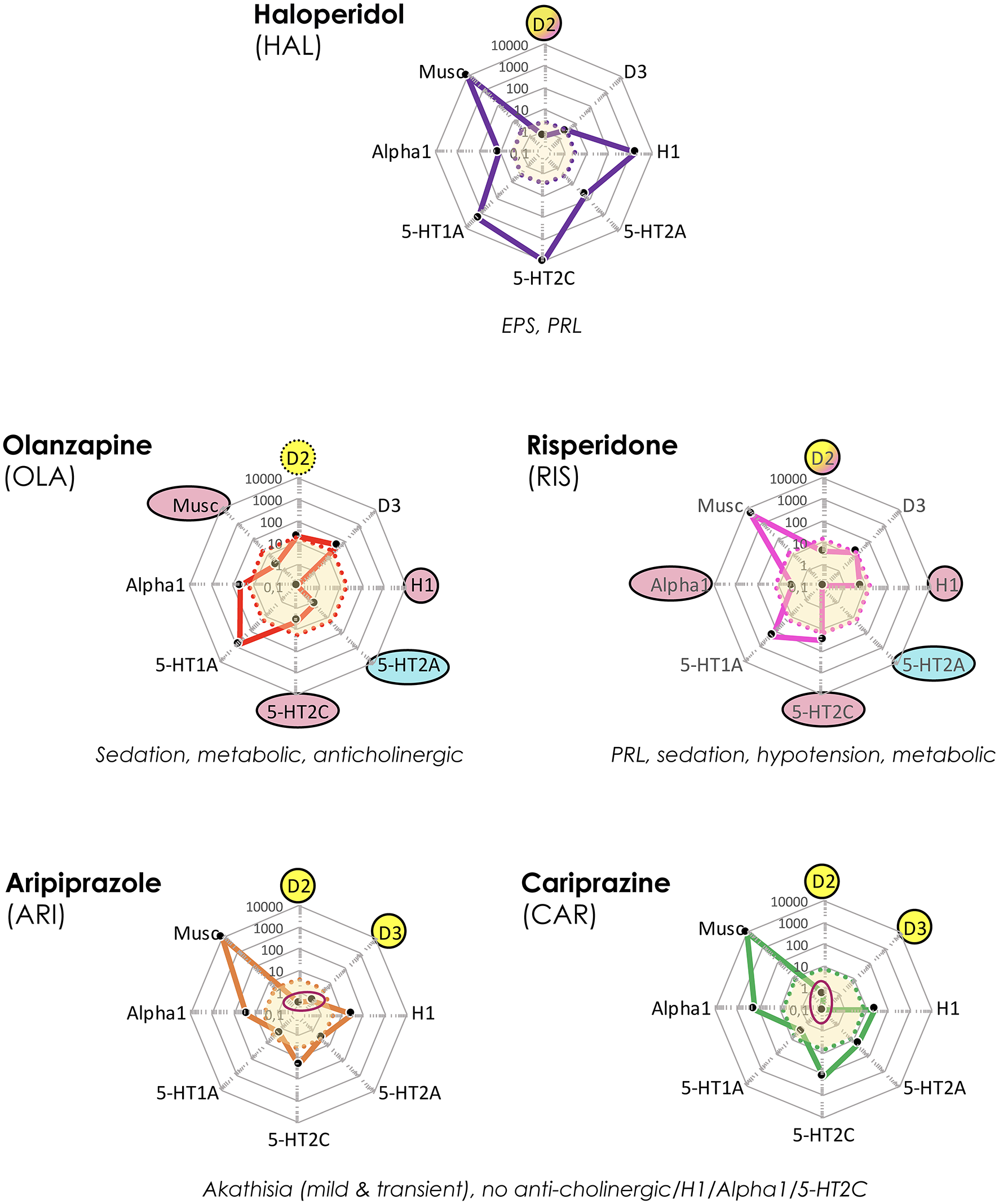 Target and associated AE profiles of HAL, OLA, RIS, ARI, and CAR. Colored lines and dots represent drug profiles based on the 8 different targets depicted at the edges of the cobweb; affinity is highest at the center, lowest at the edges (0.1–10,000 nM log scale). Dot line-enclosed shaded areas in the center represent unbound plasma levels of the compounds at efficacious therapeutic dosing. Circles and ovals depict targets likely to be affected at these levels, with colors indicating desired (yellow), accessory beneficial (light blue), and unwanted effects (red; + text below graphs). Red ovals in ARI and CAR graphs pinpoint D2 and D3 affinities. EPS, Extrapyramidal side effects; PRL, prolactin (rise). The drug cobweb profiles in this figure and Figures 5, 6 were compiled from data in public web databases and complementary literature, including drug SPC's; viz. human (cloned or native tissue) receptor affinities (22–24); therapeutic steady-state exposures1 (25); free fraction of drug plasma concentrations (26). Therapeutic steady-state exposure areas shown were obtained by converting ng/mL (25) to nM, and multiplying by the free fraction in plasma (26) for the corresponding drug.