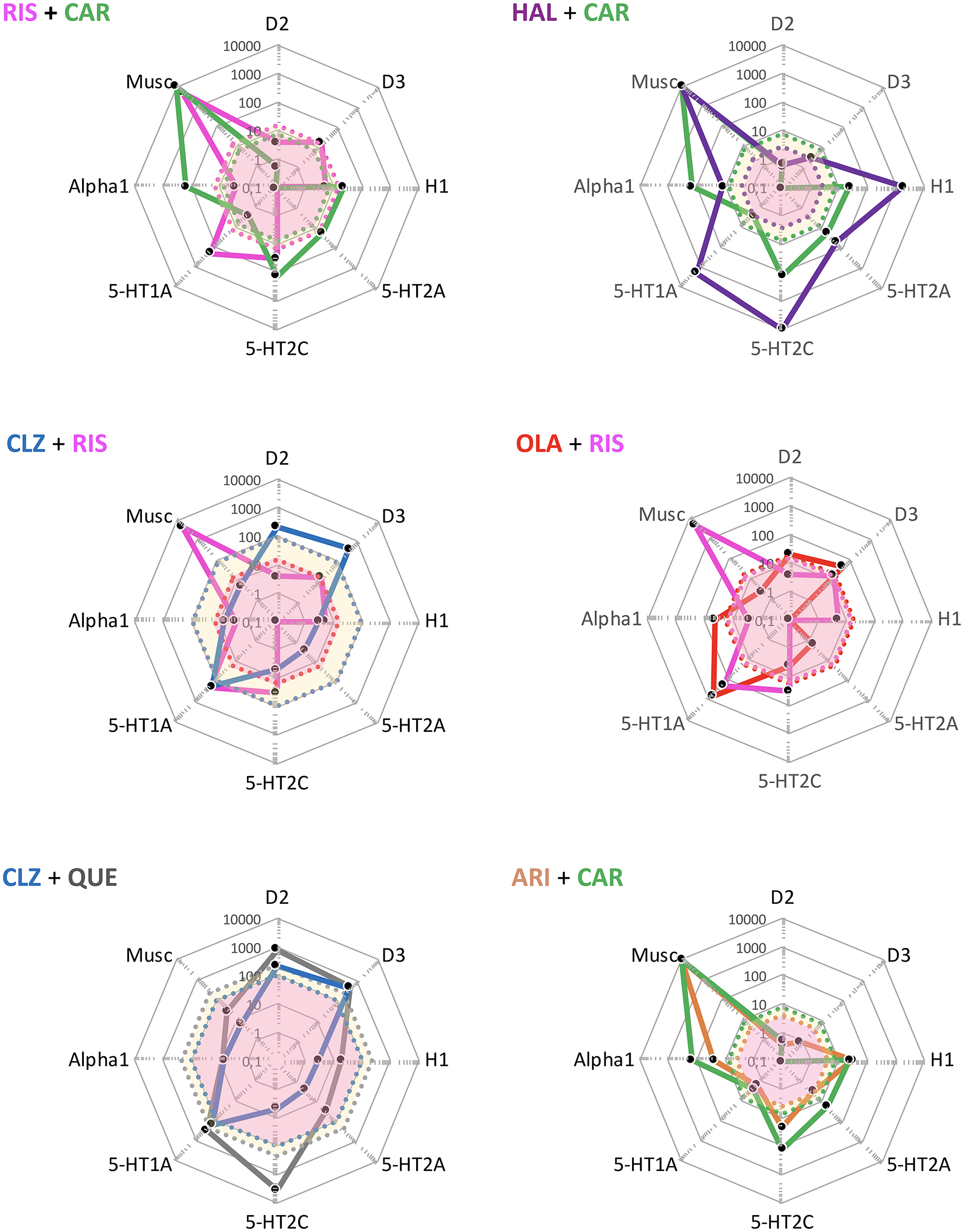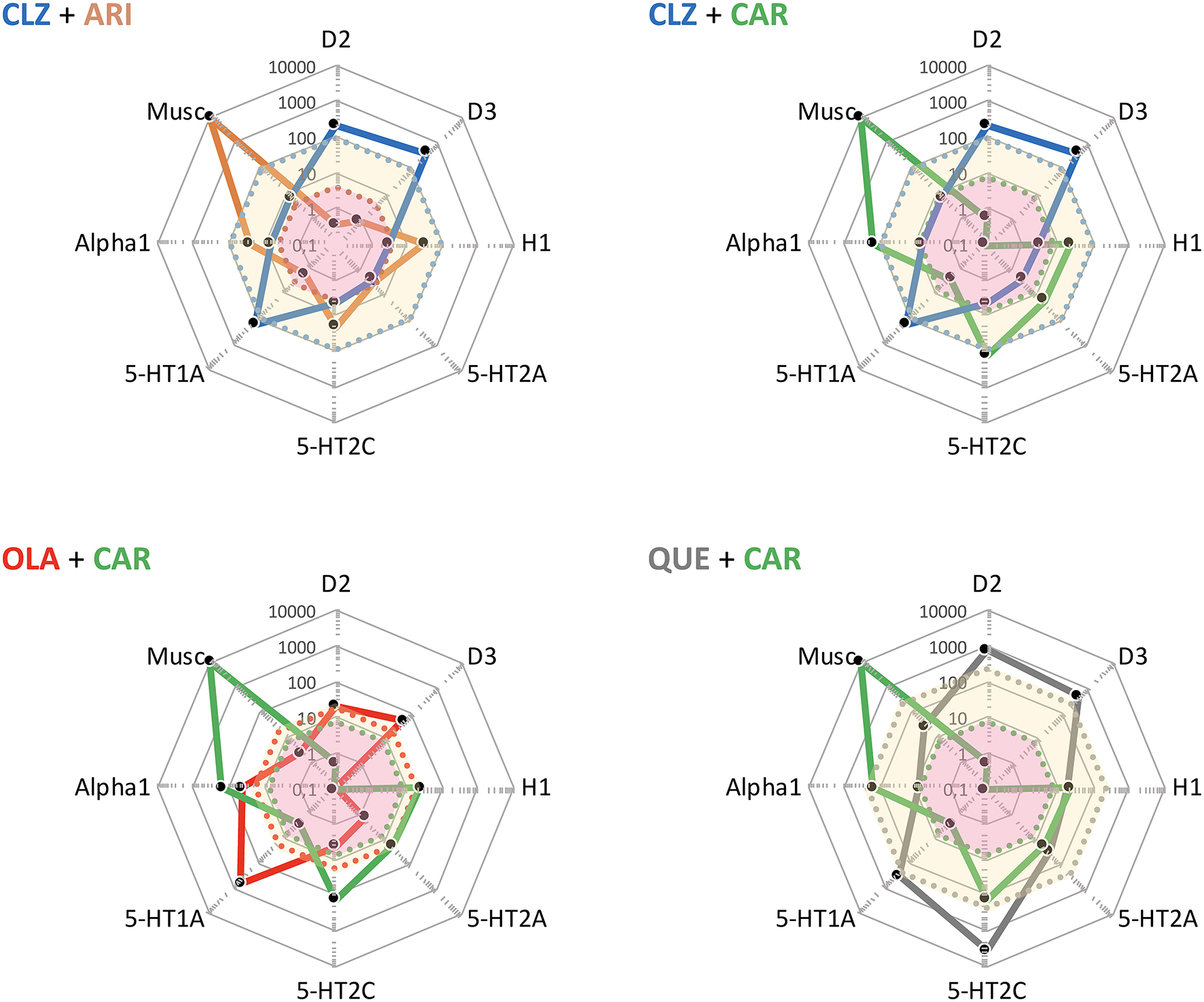 Some potentially useful APP target combinations based on FGA, SGA, and TGA. Shown are target profiles of APP combination examples based on CLZ, OLA, QUE, ARI, and CAR, displayed in a cobweb design. The colored lines joining the dots represent the target profile of the agent with corresponding color coding; e.g., blue is CLZ, and green is CAR. The dot line-enclosed shaded areas represent unbound plasma concentrations of the compounds at therapeutic dosing. For example, in the OLA + CAR case, the yellow and pink areas show unbound OLA and CAR plasma concentrations, respectively. For further explanations, see legend to Figure 4.
