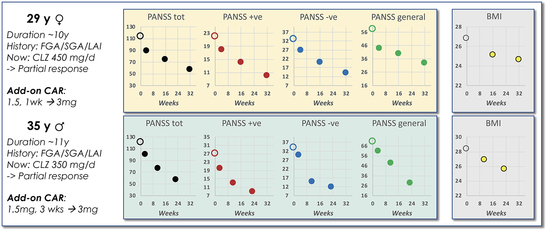 A recent review and meta-analysis of the literature (4) found superiority of APP vs. monotherapy in open-label, low-quality studies. However, method-related factors and confounders limited the generalizability of interpretations and conclusions, and in corresponding high-quality, double-blind, randomized studies there was support for enhanced efficacy only for selected APP strategies vs. monotherapy. Specifically, while no superiority was found for combinations of two FGA/SGA D2 antagonists, addition of the partial DA agonist antipsychotic ARI to CLZ medication significantly improved negative symptoms compared to CLZ alone. Given the basic pharmacology profile of CAR it appears reasonable to assume that this agent would work at least equally well to ARI as adjunct to CLZ. Actually, recent case reports concurs with this suggestion [(16, 17); vide infra], although larger, high-quality, double-blind, randomized studies will be needed for further substantiation.