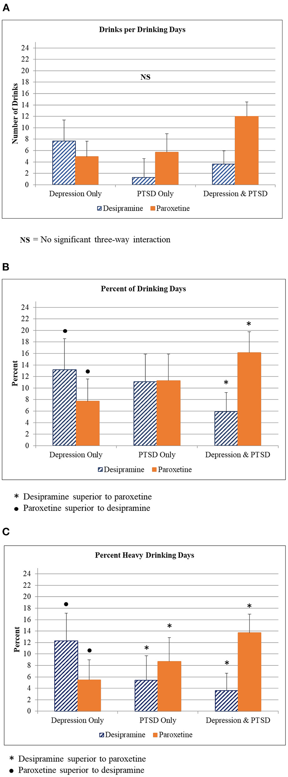 Alcohol use outcomes by diagnostic group. (A) Drinks per drinking day for participants in each diagnostic group (Depression only, PTSD only, Depression + PTSD) who were given either desipramine or paroxetine. (B) Percent of drinking day for participants in each diagnostic group (Depression only, PTSD only, Depression + PTSD) who were given either desipramine or paroxetine. Symbols indicate statistically significant differences between medications in each diagnostic group. (C) Percent heavy drinking day for participants in each diagnostic group (Depression only, PTSD only, Depression + PTSD) who were given either desipramine or paroxetine. Symbols indicate statistically significant differences between medications in each diagnostic group.
