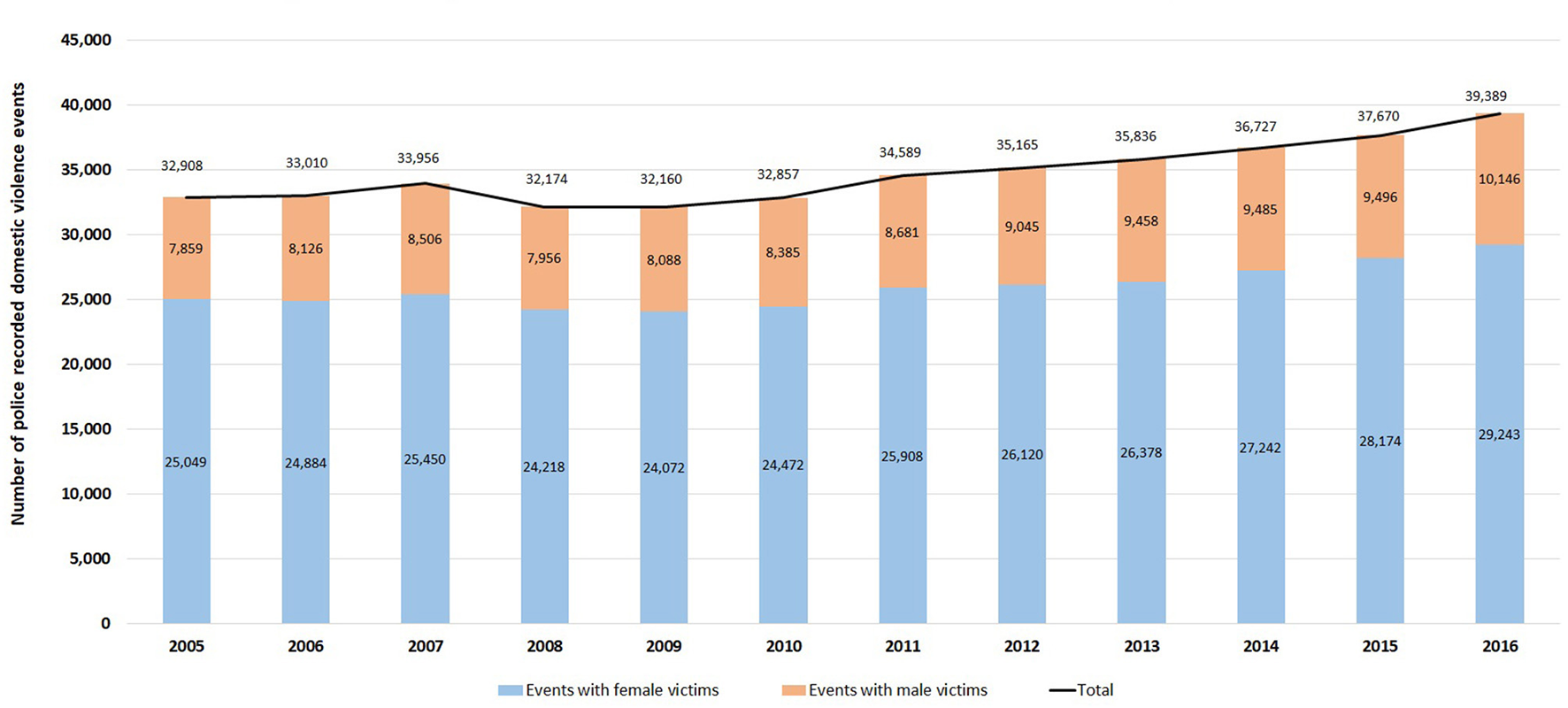 Yearly number of police recorded domestic violence events in NSW, January 2005–December 2016.