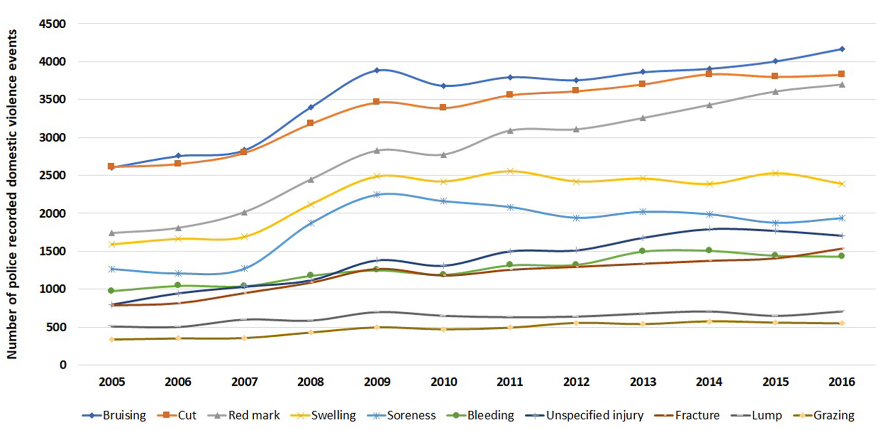 Trend in injury types (top 10 only) for victims in 416,441 police recorded domestic violence events in NSW, January 2005–December 2016.