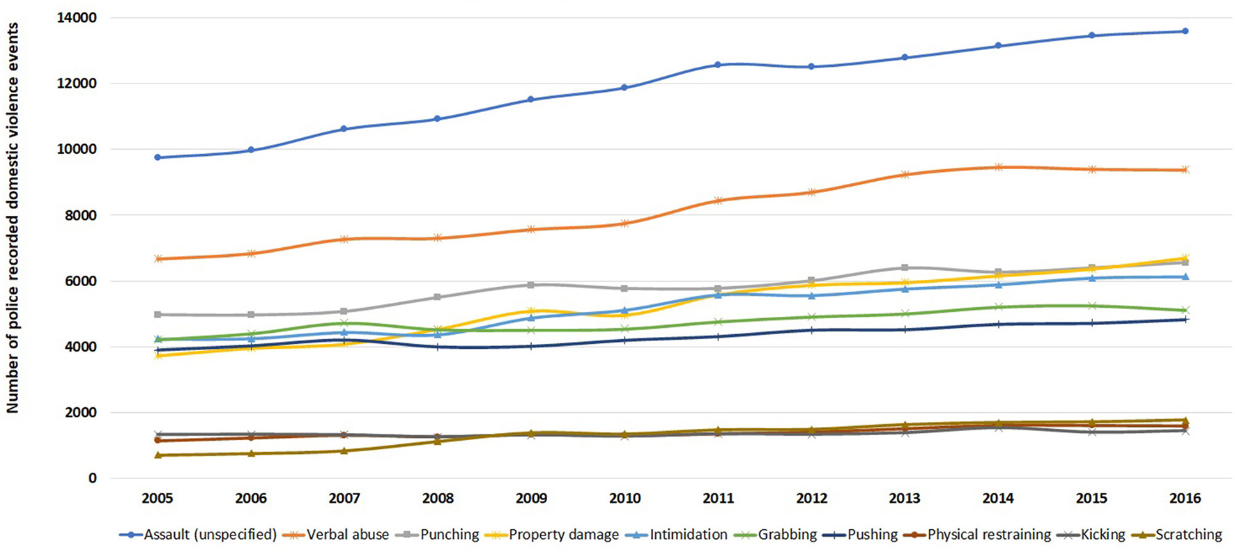 Overall, 294,024 of 416,441 police recorded domestic violence events had at least one reported abuse type between 2005 and 2016 ranging from 66.3% (in 2005) to 72.5% (in 2013) (P < 0.001; degree of freedom of 11). Assault (unspecified) was the most common abuse type recorded, occurring in more than 10,000 events each year (Figure 5).