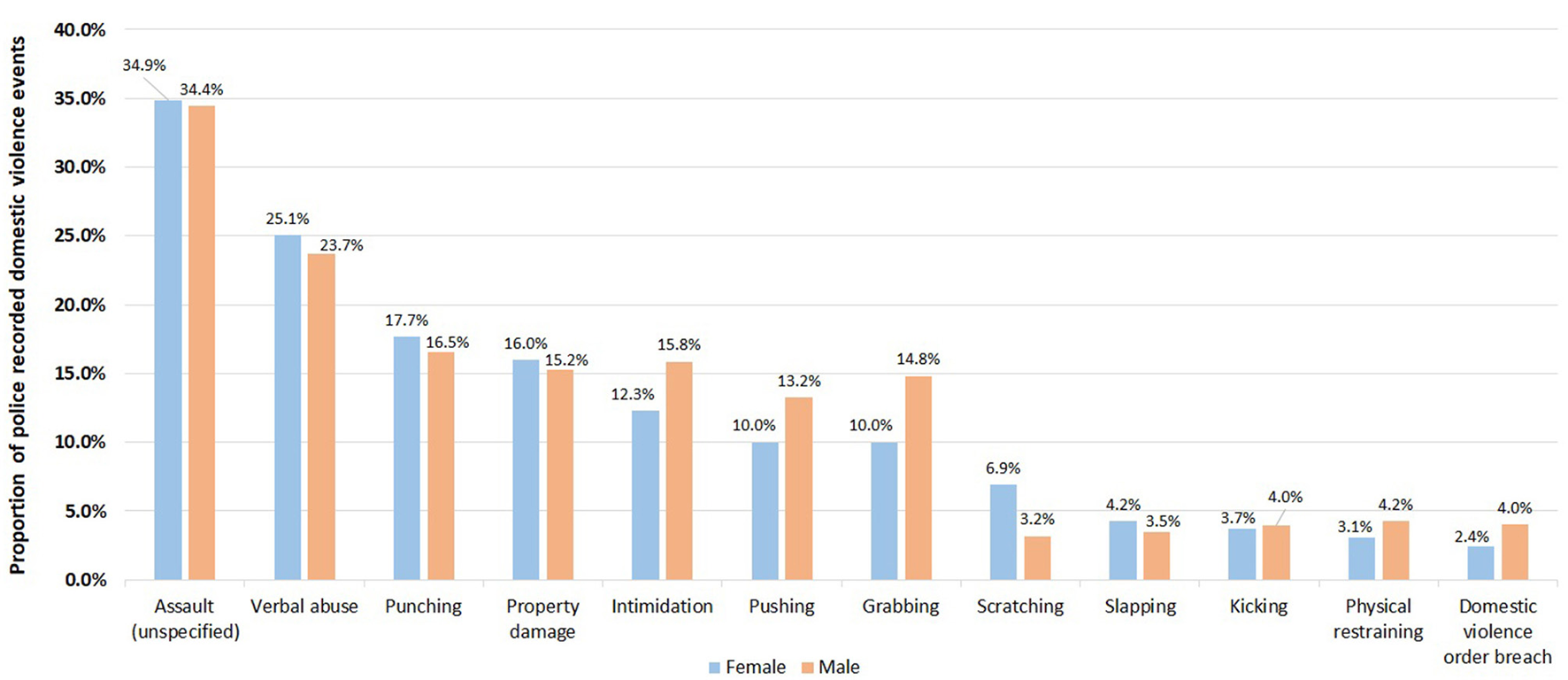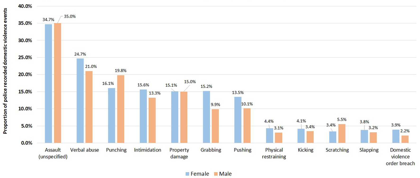 Comparison of proportions of abuse types (top 10 only) for male and female victims in 416,441 police recorded domestic violence events in NSW, January 2005–December 2016.