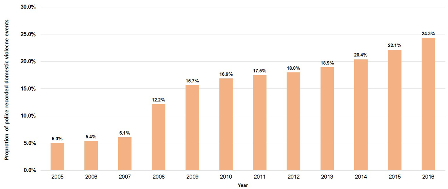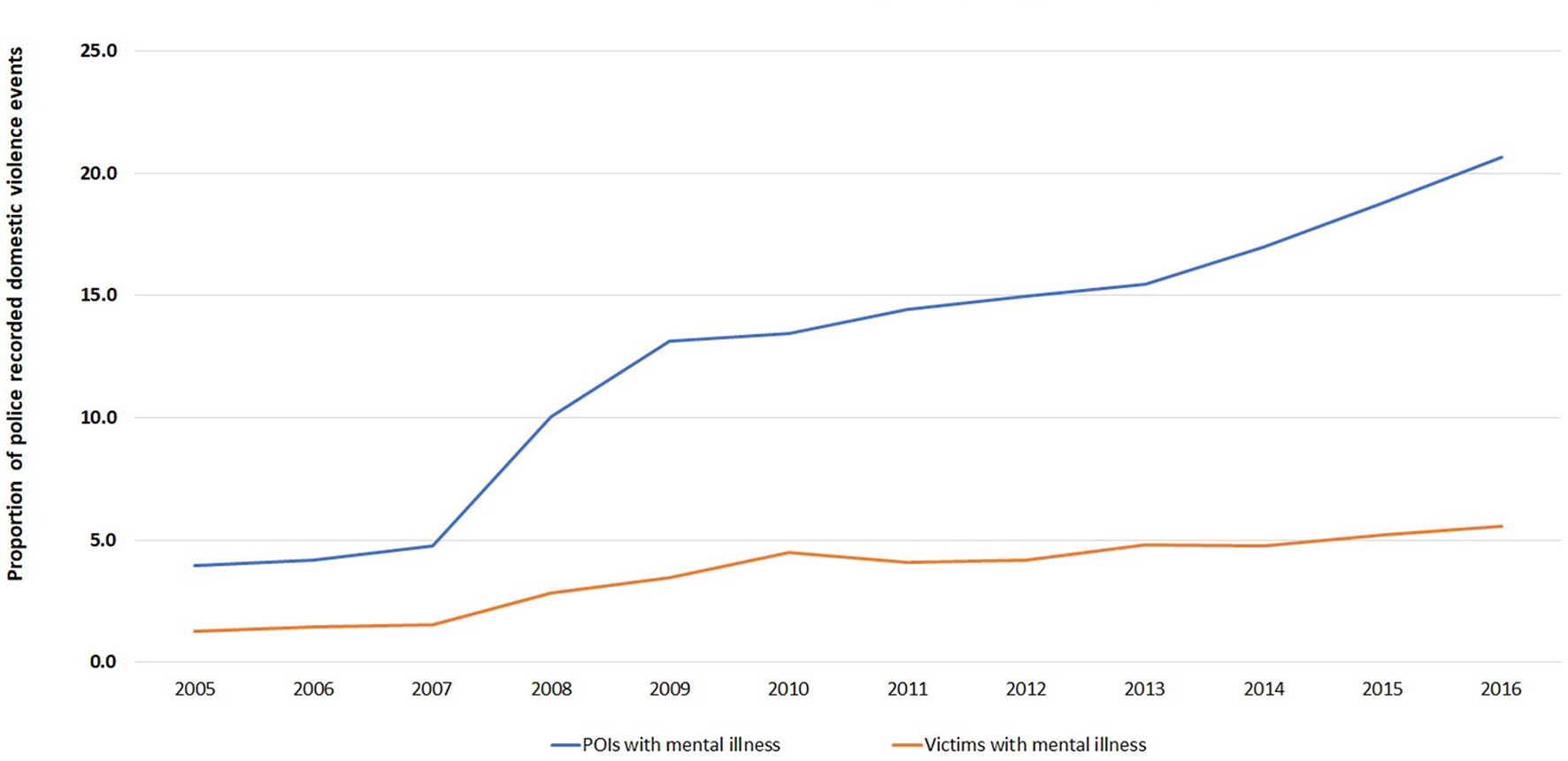 A total of 64,587 events between 2005 and 2016 had a mention of a mental illness for either the POI or victim. Overall, there was an increase in the proportion of events in which mental illness was recorded over time (Figure 8, Ptrend <0.001; degree of freedom of 11). By 2016, one in four events (24.3%) had a mention of a mental illness compared to 5.0% in 2005. The proportion of domestic violence events with a recorded mental illness has also increased most for POIs between 2005 and 2016 compared with victims (Figure 9, Ptrend <0.001 for both; degree of freedom of 1).
