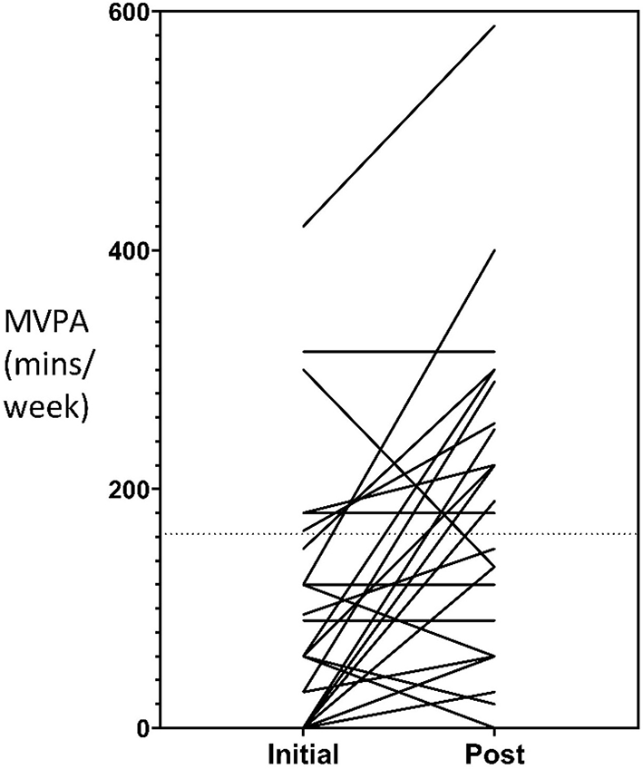 Follow-up cardiovascular fitness measures were collected for n = 32 participants (38%) and follow-up self-reported physical activity measures were collected for n = 29 participants (35%). The mean time between baseline and follow-up fitness and physical activity measures was 333 days (SD ± 180, range = 42–581) and 347 days (SD ± 178, range = 42–623) respectively. A mean increase to moderate-to-vigorous physical activity of 74-min per week occurred for participants during their involvement in the service which represented statistically significant changes (95% CI 31.9, 116.6; t = 3.6, p < 0.001). Of the n = 29 participants who completed follow-up measures, the number that met the Australian recommended guidelines for physical activity of at least 150 min of moderate to vigorous intensity exercise per week, increased from 7 (24.1%) to 14 (48.3%). A mean decrease to daily sedentary time of 1.6 h occurred which represented statistically significant changes (95% CI −2.4, 0.71; t = −3.7, p < 0.001). No statistically significant changes occurred for cardiovascular fitness and time spent walking (both p values > 0.01). Individual changes to participant's moderate to vigorous physical activity levels and sedentary time is represented graphically in Figures 1, 2, respectively.