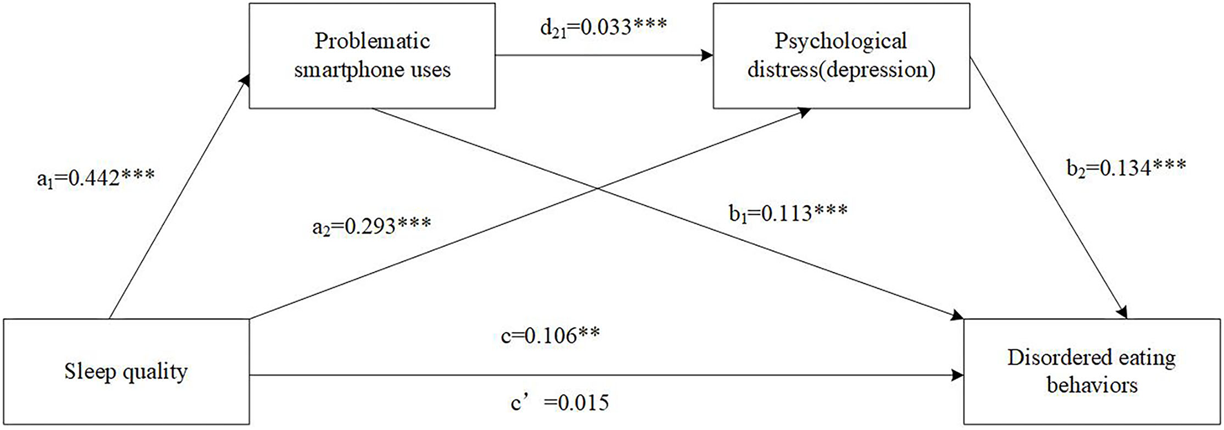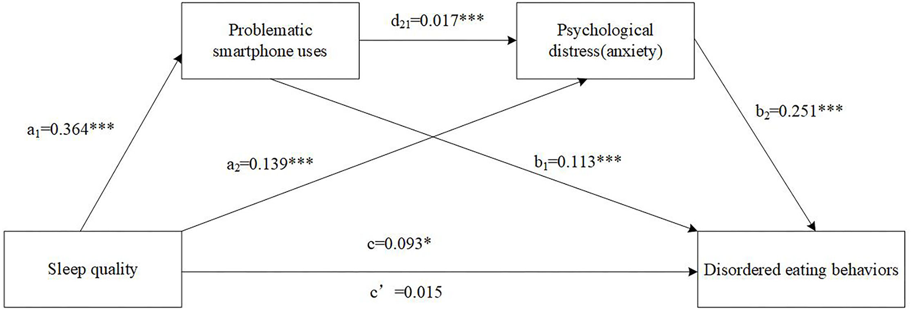 PSU has been reported to have a strong correlation with sleep quality where students' sleep quality worsens with increasing mobile phone addiction levels, and this relationship may be bidirectional (20–23). PSU is also related to EDs (24–27). Taken together, PSU could play a mediating role between sleep quality and eating disorders. Similarly, psychological distress including anxiety and depression has also been reported to be associated with sleep disorders (28–31) and EDs (12, 32–37) independently. And, the proposed mediating roles of anxiety/depression between sleep disorders and ED symptomology have been repeatedly shown in previous studies involving different samples (e.g., Inpatient, children, college women, and community adults) (9, 15, 36, 37).