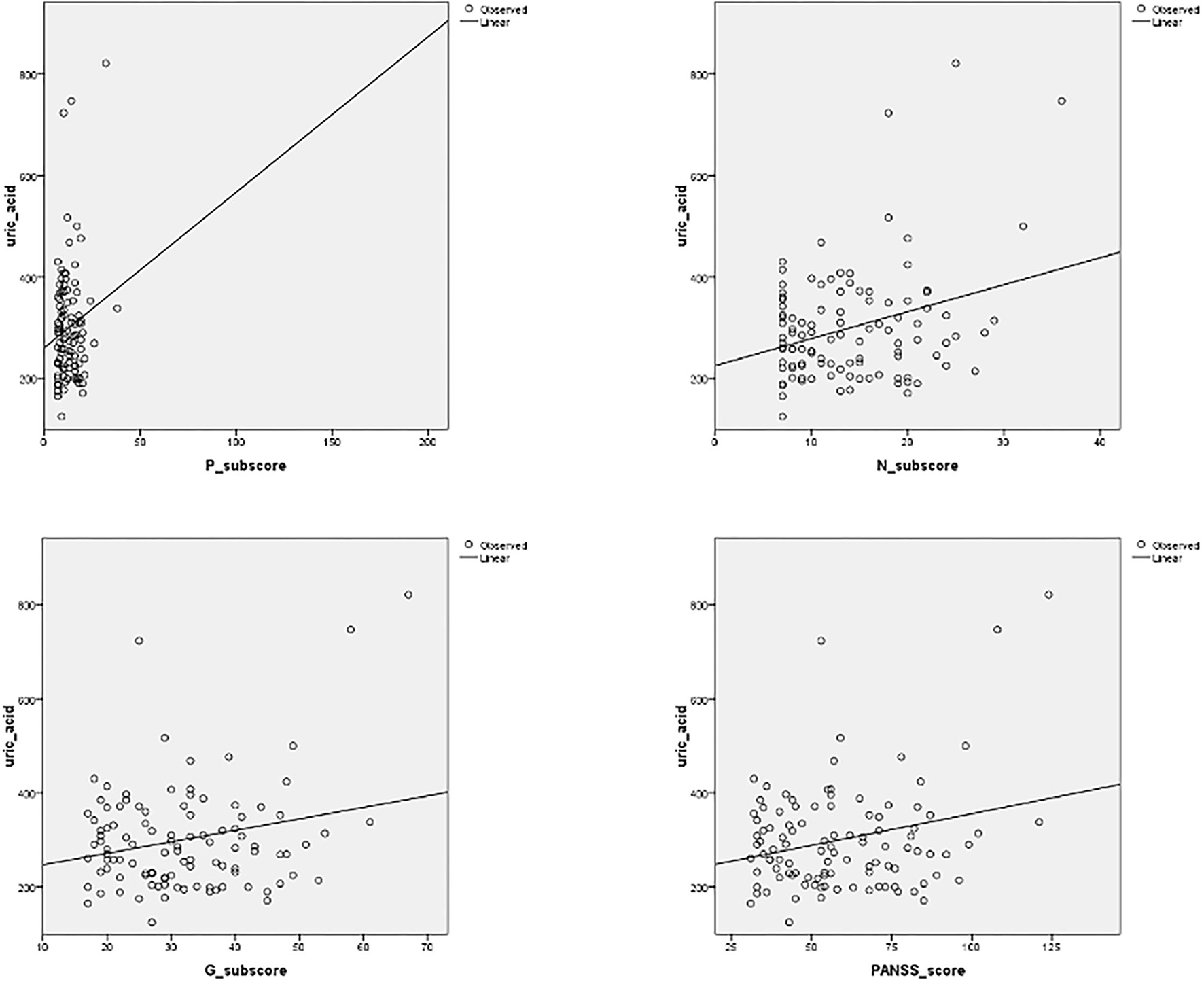 Correlation between serum uric acid (UA) levels and positive, negative (N), and general (G) sub-scores, and total PANSS (Positive and Negative Syndrome Scale) score, after 1 month of antipsychotic treatment. Significant correlation was established between UA serum levels with negative sub-score (p = 0.001, r = 0.306), general sub-score (p = 0.015, r = 0.236), and total PANSS score (p = 0.009, r = 0.3) after 1 month of therapy.