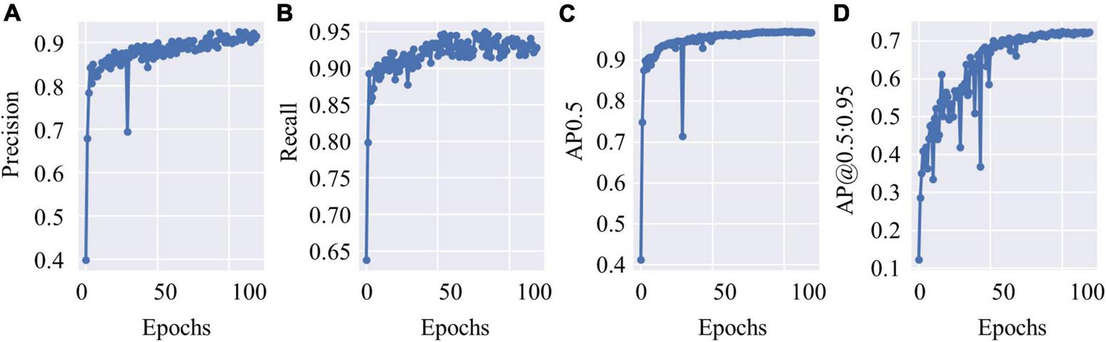 Figure 4. The test results of you-only-look-once-v5 (YOLOv5). (A) The precision values of YOLOv5 during test with epochs. (B) The recall values of YOLOv5 during test with epochs. (C) Average precisions (AP) values with the intersection over union (IoU) threshold value as 0.5. (D) AP values with different IoU threshold values that range from 0.5 to 0.95 with 0.05 step size.