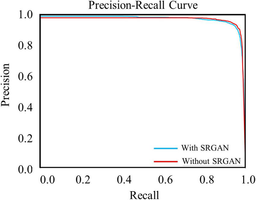 Figure 5. Precision-recall curves of target protein with (blue line) and without (red line) super-resolution generative adversarial network (SRGAN) for intersection over union (IoU) threshold of 0.5.