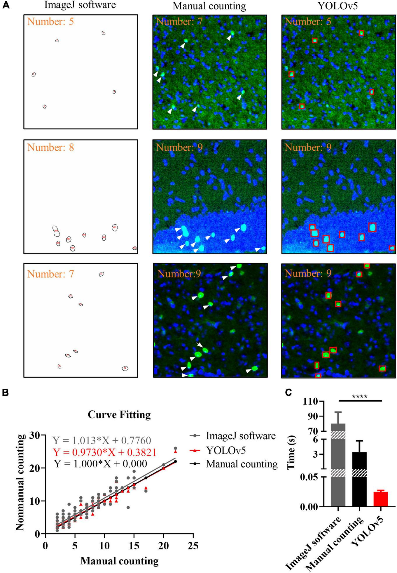 Figure 6. Results of different recognition methods. (A) Representative images of c-Fos recognition processed by ImageJ software (closed circles), manual counting (white arrows) and you-only-look-once-v5 (YOLOv5) (red boxes). (B) Curve fitting between different methods. The dots show the data and lines represent fitting curves. (C) Processing time for different methods. The data shown represent the mean ± SD values for the indicated n. ****p < 0.0001, from an independent samples t-test.