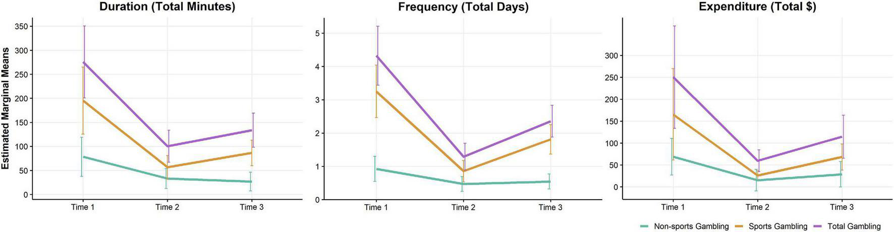 Linear mixed models were used to evaluate all hypotheses concerning changes in gambling behaviors across timepoints on gambling behavior outcomes of interest. These outcomes were defined as follows: G-TLFB total time spent gambling measured in minutes (Duration), G-TLFB total frequency of gambling measured in days (Frequency), and G-TLFB total spending measured in $CAD (Expenditure). The present study also examined each of these outcomes in relation to sports gambling (e.g., sports betting, E-sports betting, horse race betting, Daily Fantasy Sports) or non-sport related gambling (e.g., casino games, poker). Time 1 was used to refer to the 14-day period of February 26th–March 10th, 2020 (pre-pandemic baseline); Time 2 for the 14-day period of May 1st–May 14th, 2020; and Time 3 for the 14-day period of August 1st–August 14th, 2020. To examine the potential substitution of sports gambling to other forms of gambling (non-sports), and vice versa, the opposite gambling outcome and its interaction with timepoint were entered as predictors in the model. For example, when examining Duration for sports gambling as the outcome, Duration for non-sports gambling and its interaction with timepoint (coded as Time 1, Time 2, and Time 3) were entered as predictors; significant interactions indicated substitution effects. Covariates for all models included demographic variables (age, sex, monthly spending, marital status, recruitment source) and psychological variables (PGSI score, five mini-IPIP subscale scores, and three GMQ subscale scores). These covariates were selected to control for known associations with gambling behavior. Linear mixed models were estimated using the nlme package (version 3.1-153) in R (version 4.2.1), and estimated marginal means were calculated using the emmeans package (version 1.7.2).