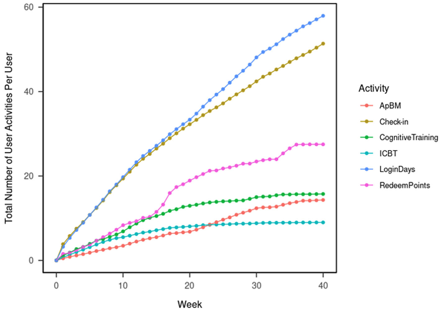 We calculate and plot the cumulative numbers of ICBT sessions, ApBM trainings, cognitive trainings, reward point redemptions, daily check-ins, and login days per user by week up to 40 weeks after initial enrollment.