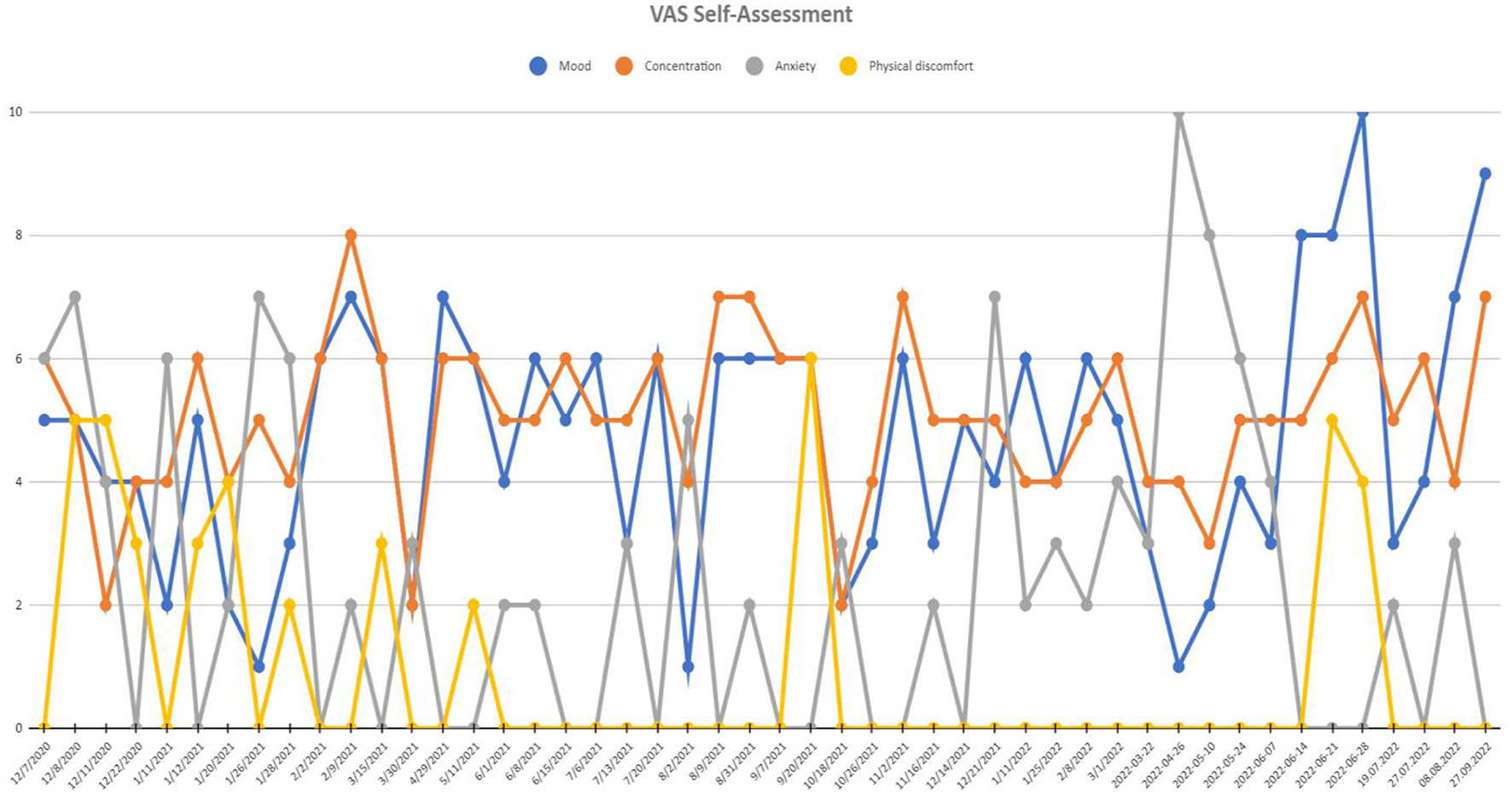 Visual analog scale (VAS) of self-assessment scores at recruitment point and during 20 months of active DBS stimulation period. Mood and concentration scales were scored positively (0-worst mood and concentration and 10-best mood and concentration), while anxiety and physical discomfort scales were scored negatively (0-least intensive anxiety and discomfort and 10-most intensive anxiety and discomfort).