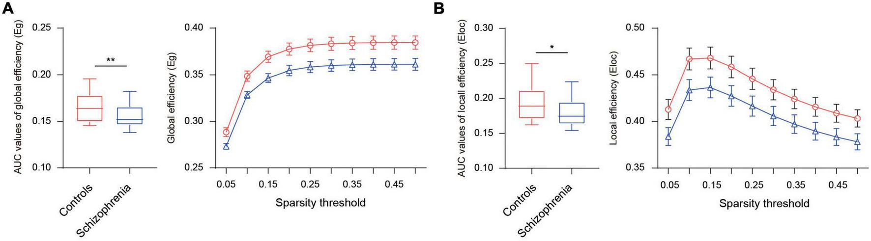 The global efficiency and local efficiency were computed separately for each sparsity threshold. The area under the curve (AUC) of such metrics was then computed to produce a summarized scalar, which was independent of a specific threshold selection. The AUC values of global efficiency and local efficiency were compared between-groups using two-sample T-tests.