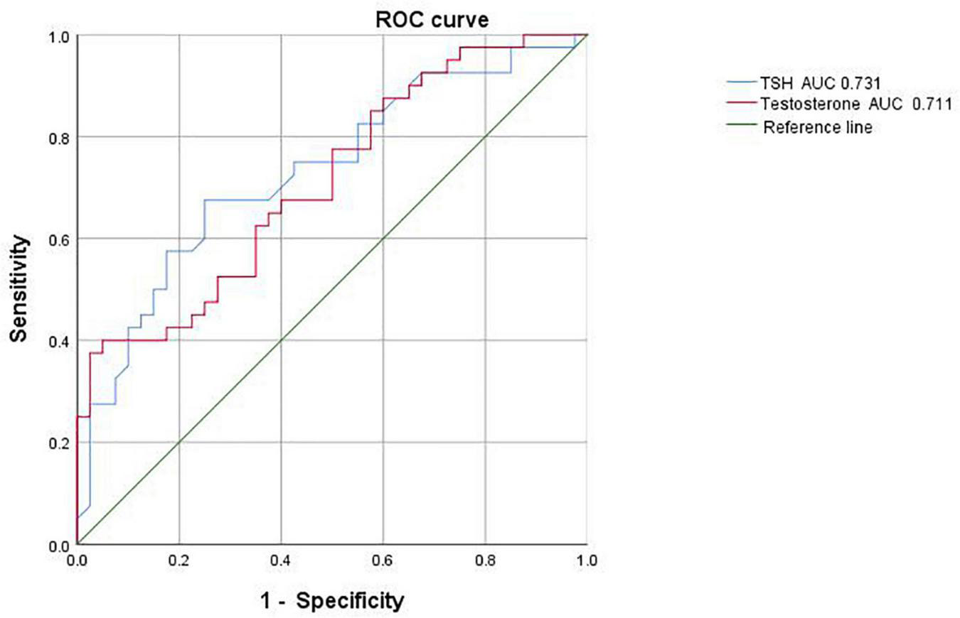 Receiver operating characteristic curve analysis based on the above indicators showed that the critical value for TSH prediction was 3.225 μIU/ml, with an AUC of 0.731, sensitivity of 67.5% and specificity of 75%; the critical value for testosterone prediction in male adolescent depressed patients with NSSI behavior was 23.995 nmol/L, with an AUC of 0.711, sensitivity of 40% and specificity of 95% (Figure 2).