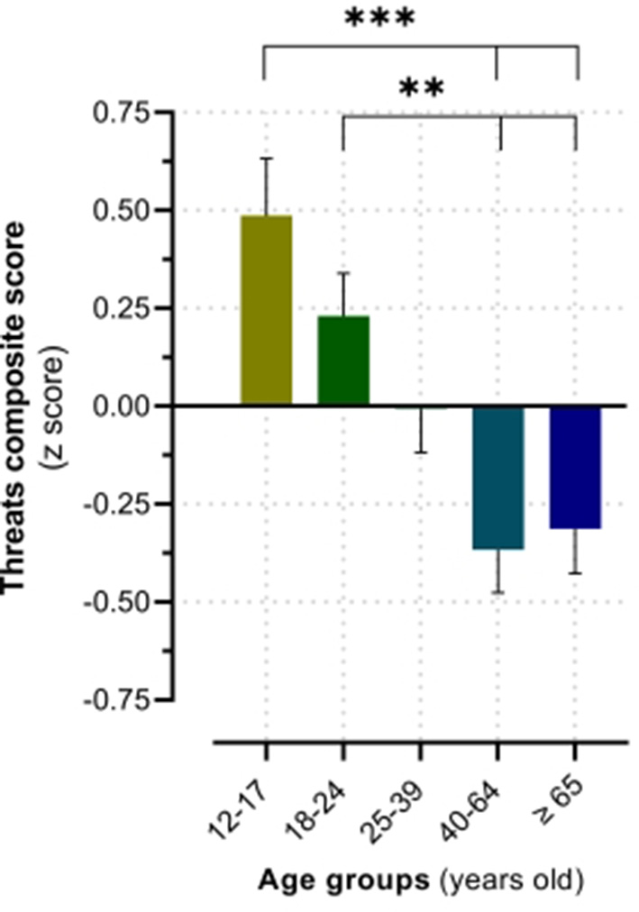 Age group differences in the threatening tone of dreams. The values are expressed as means ± SEM, N = 255. **p < 0.01, ***p < 0.001.