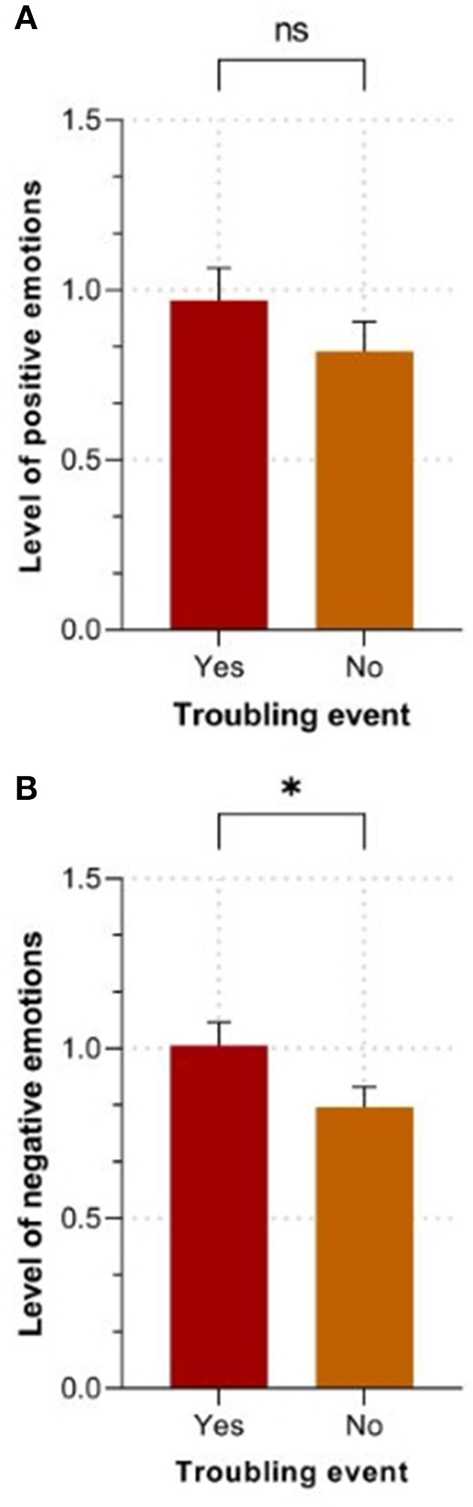 Main effect of the experience of a recent troubling event on emotion levels in dreams. (A). Level of positive emotions. (B). Level of negative emotions. The values are expressed as means ± SEM, N = 253. *p < 0.05, ns = p > 0.05.