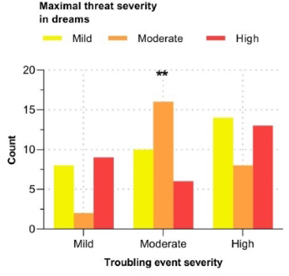 In those who recently experienced a troubling event and had a threatening dream (N = 125), a 3 (severity of troubling event) by 3 (severity of oneiric threat) chi-square test of independence was conducted to examine the association between severity of the event and maximal severity of threats in dreams. This analysis revealed that the severity of a recent troubling event and severity of threats in dreams are significantly associated, X2(4) = 11.09, p = 0.026. Post-hoc comparisons demonstrated that recently experiencing a moderately threatening event during waking was significantly associated with moderate severity for the maximal threat in dreams, p = 0.002 (see Figure 4).