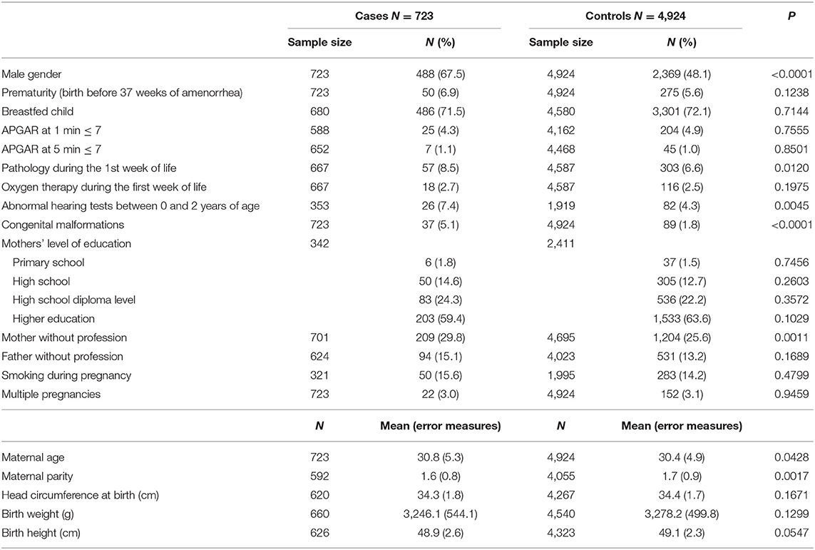 Characteristics of case and control subjects, such as gender, prematurity (birth before 37 weeks of amenorrhea) and the presence of congenital malformation(s) coded according to the International Classification of Diseases 10th Revision (ICD-10) (17), were described. Characteristics of their parents (maternal age, maternal education, and parents who have no profession) were also presented. Categorical variables were described by the frequency and proportion of each modality and quantitative continuous variables by mean and standard deviation.