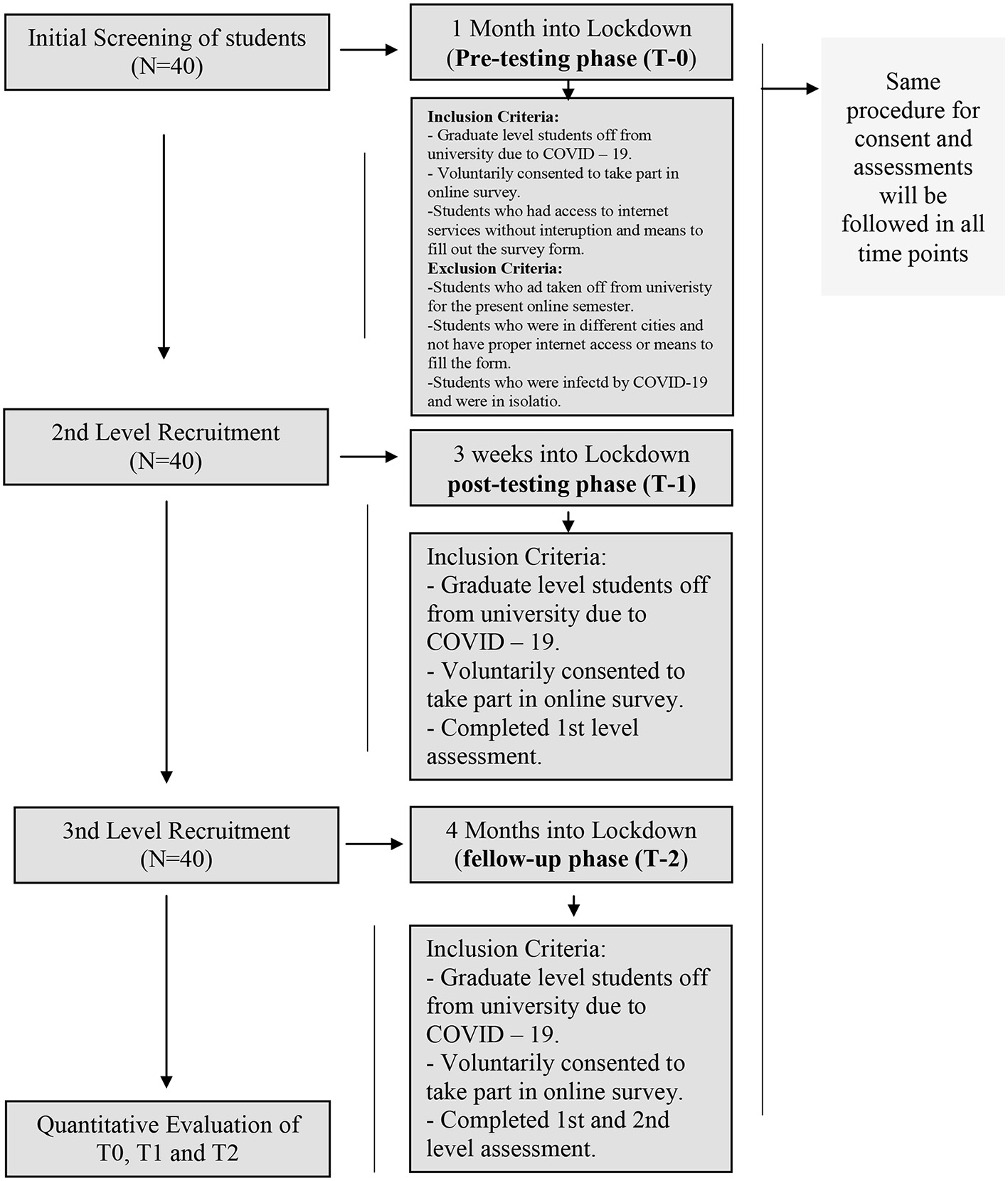 After the pretesting phase (T-0), the same 40 participants were asked to fill up the same survey questionnaire for the posttesting phase (T-1), which occurred after 22 days (3 weeks) of full lock down, as the full lockdown was lifted and converted into partial (smart) lockdown after that. Last, after the pretesting phase (T-0) and posttesting phase (T-1), the same set of participants were again asked to fill up the forms (T-2) after 5 months as a follow-up, when the smart lockdown was about to end. All participants filled out an online questionnaire in two phases, including the pretest phase (T-0). The government-imposed T-0 when authorities closed universities suddenly due to the ongoing pandemic and began a complete lockdown. After the pretest phase (T-0), the same 40 participants were asked to complete the same questionnaire for the phase of posttest (T-1) after a complete lockdown of 22 days (3 weeks). After the complete lockdown was lifted, the authorities converted the full lockdown into a partial (smart) lockdown. After the pretest phase (T-0) and the posttest phase (T-1), the same 40 participants were asked to fill out the form (T-2) again 5 months later as a follow-up when the smart lockdown was about to end.