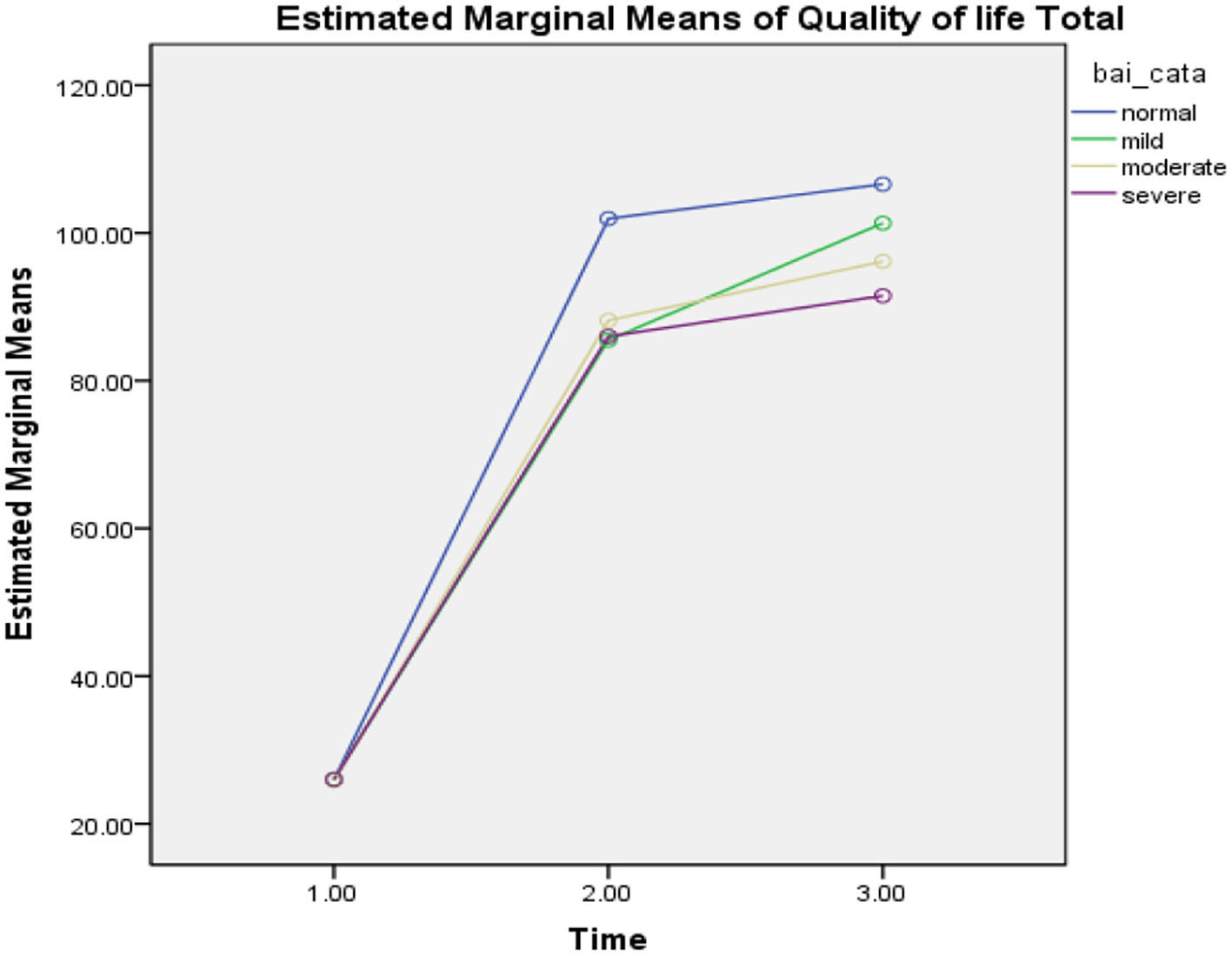 In the first phase of the lockdown in Pakistan (T = 0), when all universities were closed due to the COVID-19 epidemic, participants reported significant decline in quality of life with different levels of anxiety as normal (M = 25.94, SD = 0.23, n = 18), mild (M = 26.00, SD = 0.02, n = 8), moderate (M = 25.80, SD = 0.44, n = 5), and severe (M = 26.00, SD = 0.01, n = 9), while in phase 2 (T = 1), participants demonstrated more improvement in the quality of life with different levels of anxiety, such as normal (M = 101.93, SD = 13.01, n = 16), mild (M = 85.50, SD = 24.14, n = 8), moderate (M = 88.16, SD = 9.70, n = 6), and severe (M = 86.00, SD = 13.78, n = 10). On the other hand, in phase 3 (T = 2), when the university was conducting their semester exams, participants illustrated more slight improvement in the quality of life with higher level of anxiety, such as normal (M = 106.60, SD = 10.79, n = 15), mild (M = 101.33, SD = 15.82, n = 9), moderate (M = 96.16, SD = 8.70, n = 6), and severe (M = 91.50, SD = 13.35, n = 10). In the table above, the findings of the study revealed that those participants who had reported moderate and severe levels of anxiety, had lower level of quality of life compared with those who had normal and mild level of anxiety, who were also found to have a higher level of quality of life during the COVID-19 epidemic lockdown in Pakistan (see Figure 3).