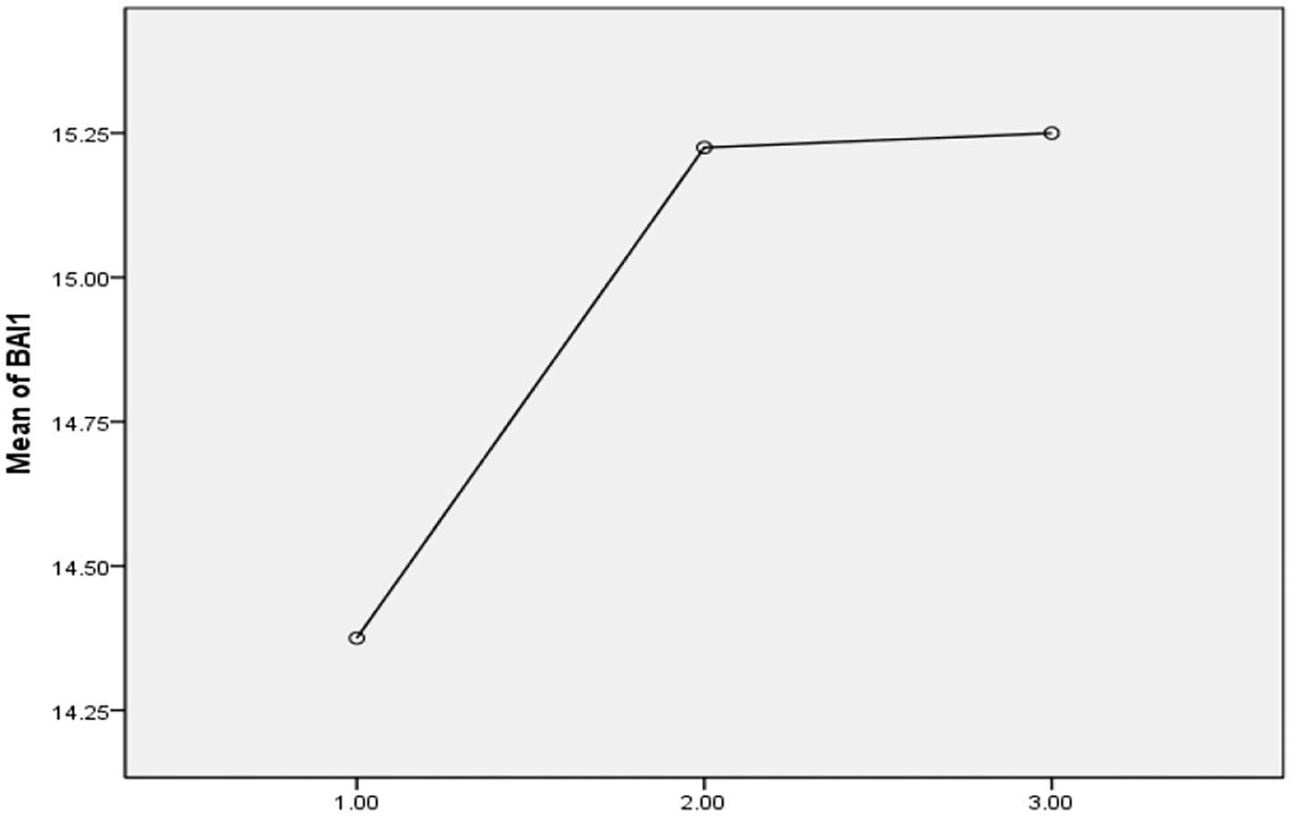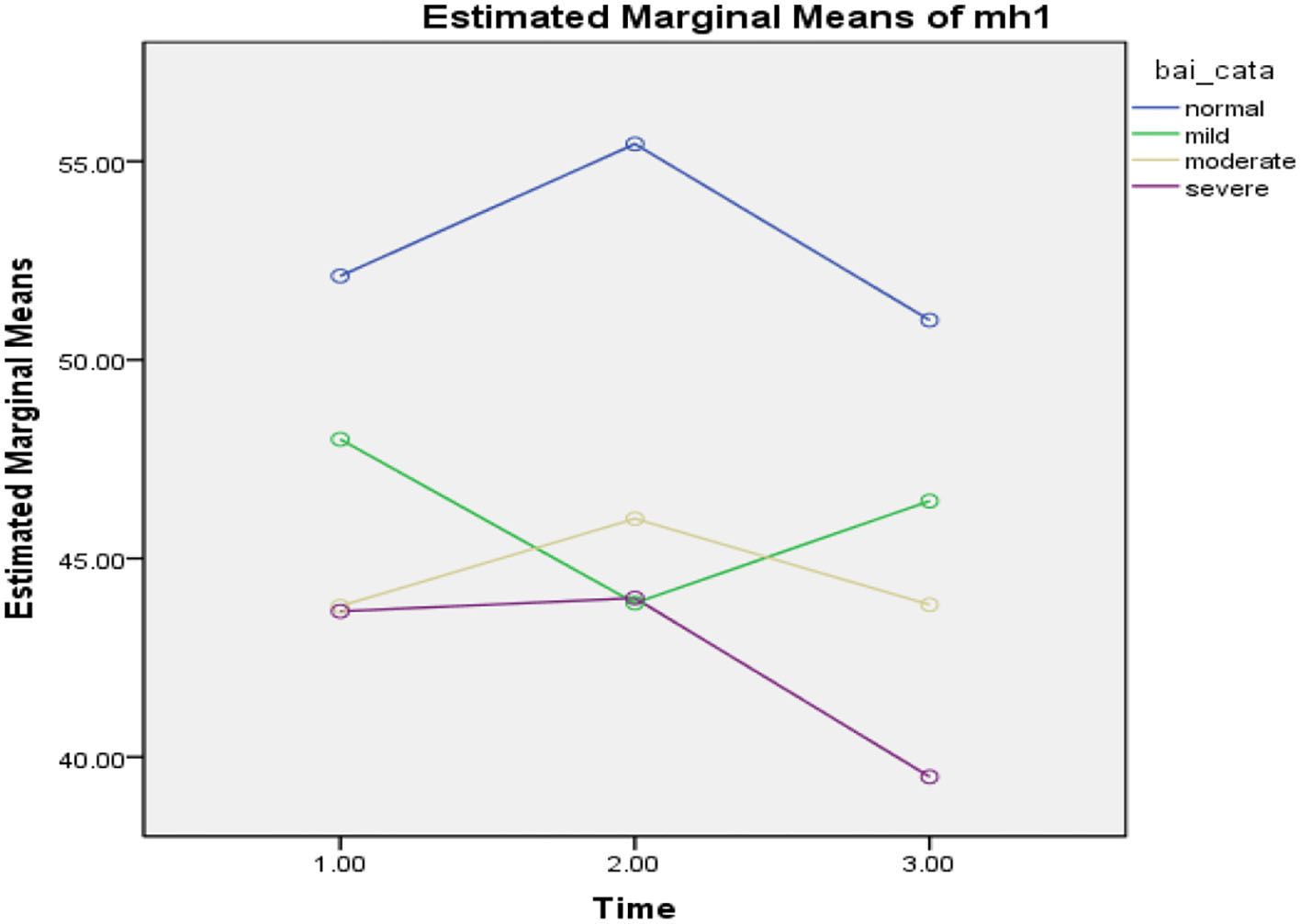Repeated measures ANOVA was applied and showed a significant effect of the COVID-19 epidemic lockdown on mental health in the three phases (F = 1.02, p = 0.39), level of anxiety (BAI) (F = 19.81, p = 0.002), and interaction effect between level of anxiety and the three phases (F = 0.40, p = 0.87, = 0.99). The findings of the study demonstrated that participants had a significant decline in mental health having different levels of anxiety at the three phases (see Figure 5).