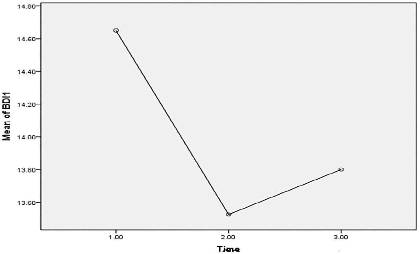 Repeated measures ANOVA was carried out and illustrated the significant effect of the COVID-19 epidemic lockdown on the quality of life in the three phases (F = 210.46, p = 0.000), level of depression (BDI) (F = 2.82, p = 0.12), and interaction effect between level of depression and the three phases (F = 1.21, p = 0.30, =0.98). The findings of the study revealed that participants had a significant improvement in the quality of life at the three phases (see Figure 4).