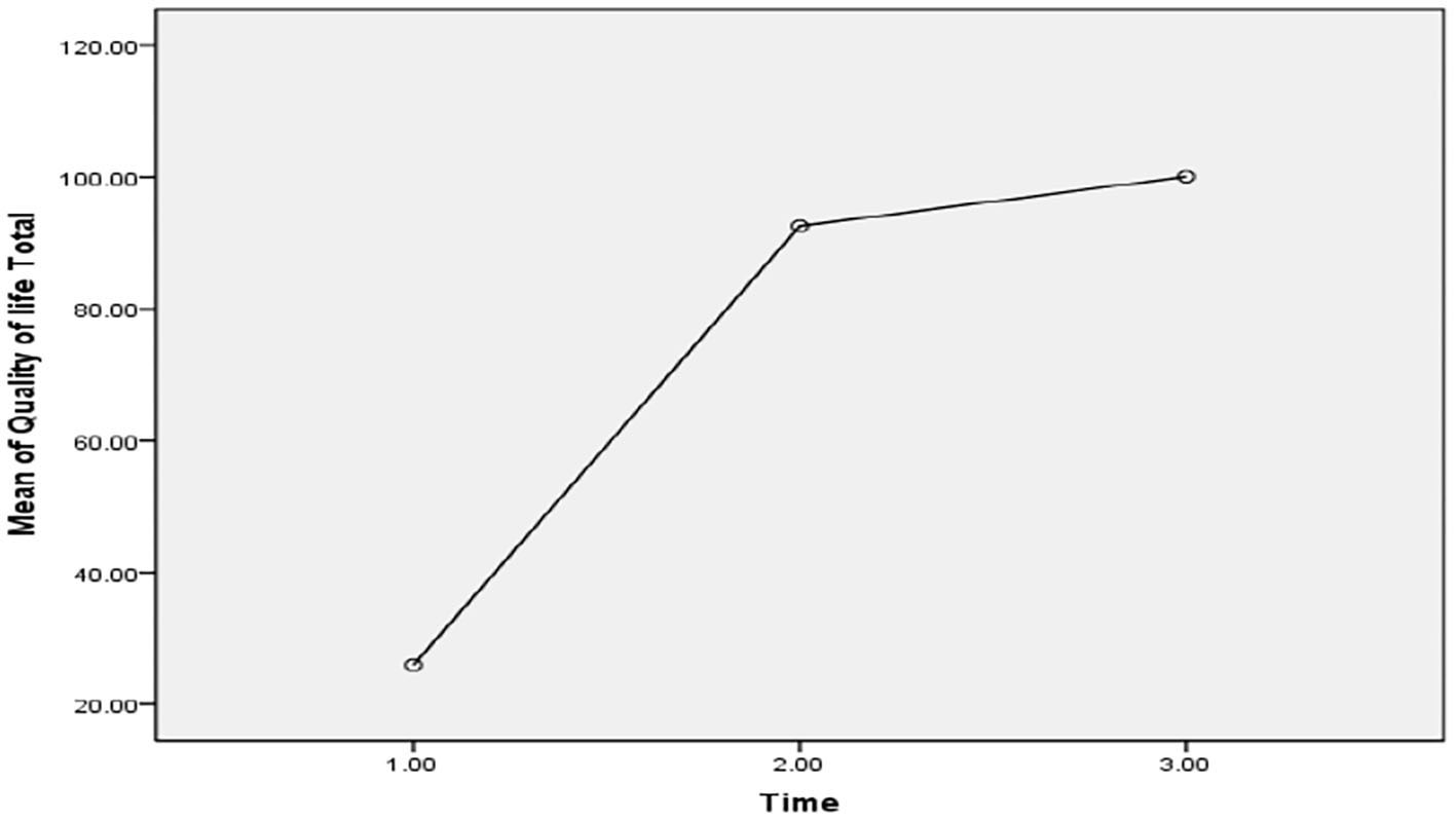 In Table 3, repeated measures ANOVA was used and displayed significant effect of the COVID-19 epidemic lockdown on the quality of life in the three phases (F = 215.35, p = 0.000), level of anxiety (BAI) (F = 2.99, p = 0.12), and interaction effect between the level of anxiety and the three phases (F = 1.94, p = 0.08, = 1.99). The findings of the study revealed that participants exposed significant improvement in the quality of life at the three phases (see Figure 3).