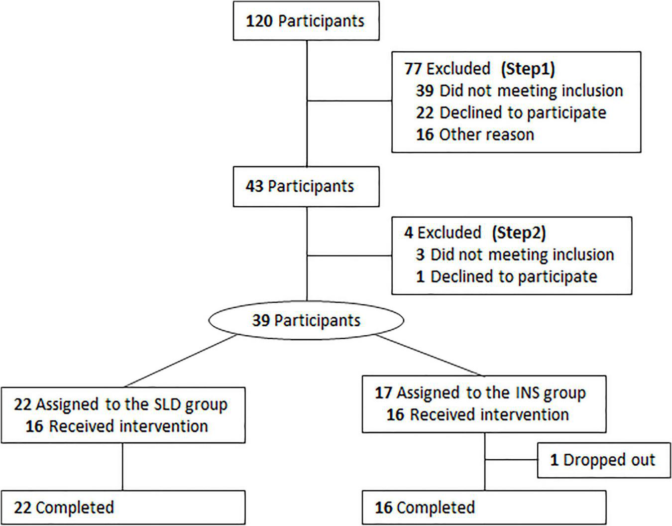 Participants who responded to the advertisements underwent a two-step screening process, which consisted of (1) a telephonic screening and (2) a medical interview by well-trained psychiatrists to ensure that participants met the inclusion and exclusion criteria (Figure 1). A total of 120 participants were screened by telephone, and 77 participants were excluded (step 1). The remaining 43 participants completed the Japanese version of the Pittsburgh Sleep Quality Index (PSQI) (19), the Sheehan Disability Scale (SDISS) (20), the 9-item Patient Health Questionnaire (PHQ-9) (21, 22), and the State-Trait Anxiety Inventory (STAI) (23), after which they underwent step 2. After excluding 4 more participants who did not meet the appropriate criteria or who declined to participate, 39 participants were ultimately included. They completed a clinical interview conducted by well-trained psychiatrists according to the DSM-5 criteria for the diagnosis of insomnia disorder (18). Participants who met the criteria for insomnia disorder were assigned to the insomnia disorder (INS) group (n = 17). Participants who did not meet at least one of the following criteria were assigned to the sleep difficulty (SLD) group (n = 22): (1) Significant distress or interference with personal functioning in daily living caused by the sleep difficulty; (2) occurrence of sleep difficulty at least three times a week; (3) presence of sleep difficulty for at least 3 months. One participant in the INS group dropped out during the baseline session. Ultimately, 22 participants in the SLD group and 16 participants in the INS group completed the whole study protocol and were included in the final analysis.
