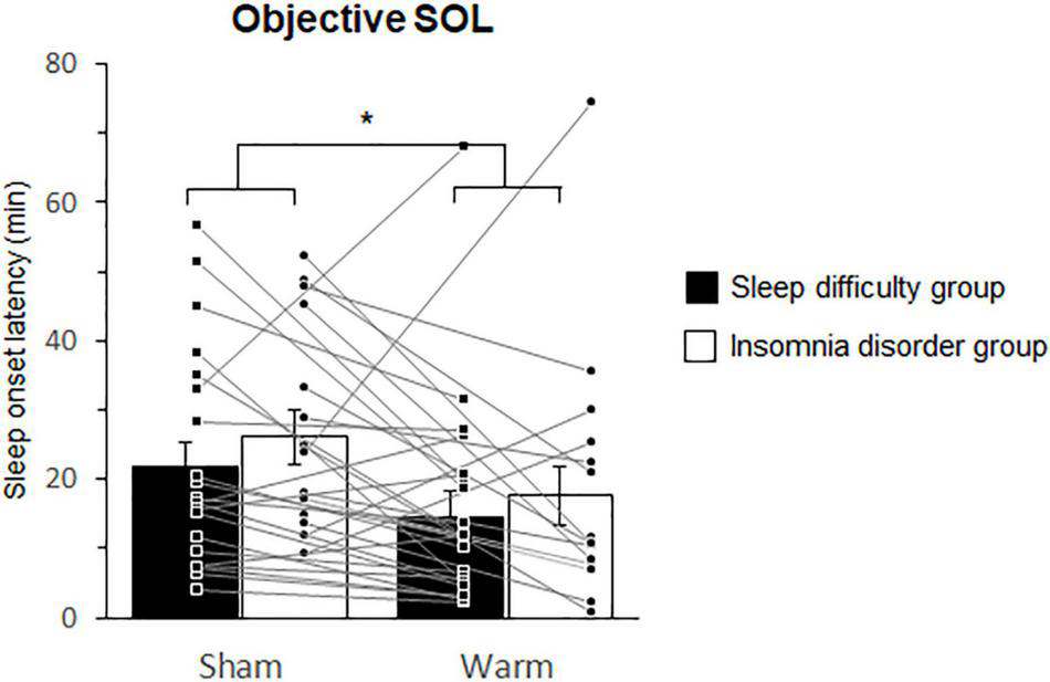 Comparisons of the objective sleep onset latencies between the sham and warm conditions. SOL. Bars and error bars represent the mean ± standard error of the mean (SEM). SOL, sleep onset latency. *p < 0.05.