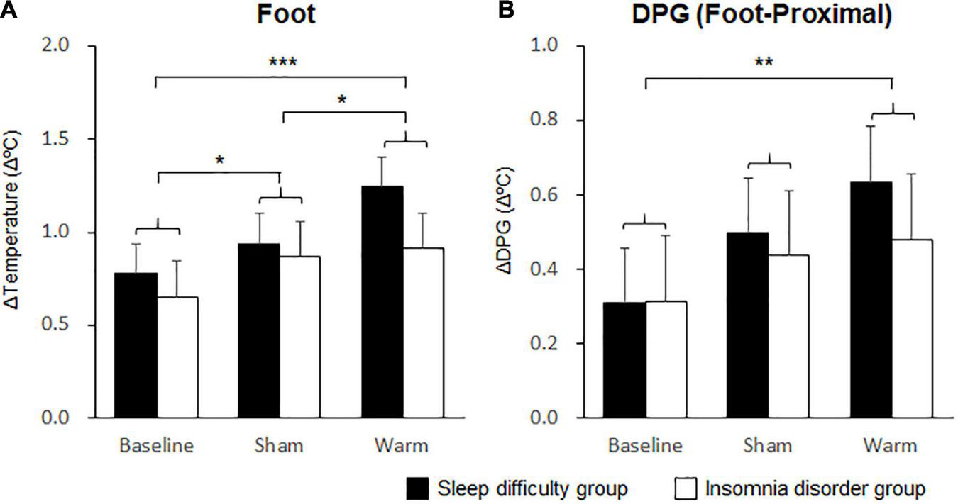 Comparisons of foot skin temperature and distal-proximal skin temperature gradient (DPG) between foot and proximal skin temperatures. (A) The mean changes in foot skin temperature over 30 min. (B) The mean changes in DPG between the foot and proximal skin temperature over 30 min. Bars and error bars represent the mean ± standard error of the mean (SEM). *p < 0.05, **p < 0.01, ***p < 0.001.