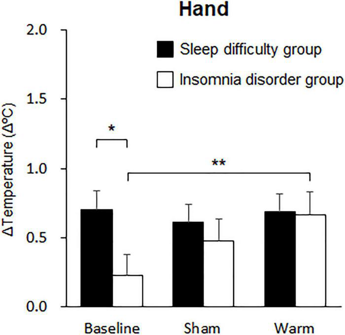 Comparisons of changes in hand skin temperature over 10 min. The black bars represent the sleep difficulties group, and the white bars represent the insomnia disorder group. Bars and error bars represent the mean ± standard error of the mean (SEM). *p < 0.05, **p < 0.01.