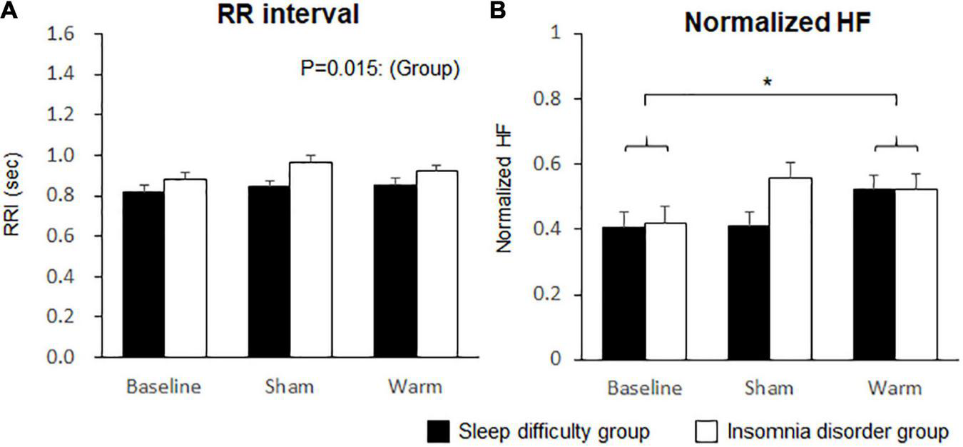 The data distribution and equality of variances of the objective and subjective SOL data were verified using the Shapiro-Wilk normality tests and Levene’s tests, respectively. Then, the objective and subjective SOL values were compared between the sham and warm conditions using two-way ANOVA with “group” and “condition” as fixed effects. The hand and foot skin temperature with respective DPGs over the initial 30 min (6 × 5-min bins) after the time into bed were analyzed using a mixed-model three-way ANOVA with “group” and “condition” as fixed effects. The R-R interval, HF, and normHF for the initial 5 min after the time into bed were also analyzed using a two-way ANOVA with “group” and “condition” effects. Post hoc comparisons were performed using Bonferroni’s correction test with an adjusted p-value. Furthermore, backward stepwise multiple regression analysis was conducted to identify the contribution of thermoregulatory variables and HRV to objective or subjective SOLs. The level of significance was set at 5% (two-sided test). All statistical analyses were performed using IBM SPSS Statistics 25 (IBM, Chicago, IL, United States).