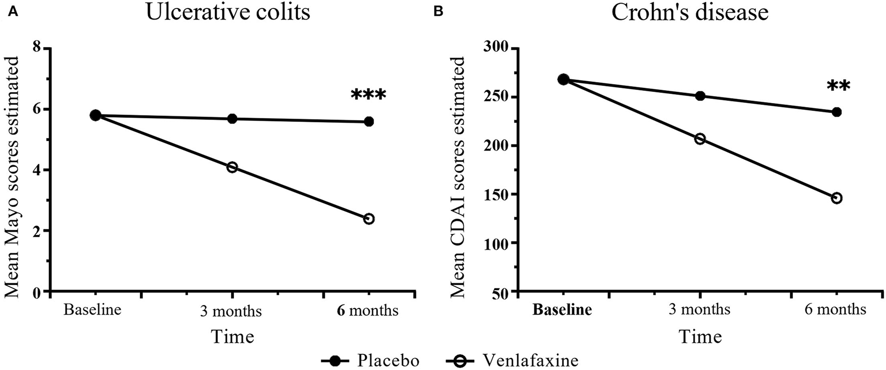 A prospective, randomized, double-blind, and placebo-controlled clinical trial was conducted. Participants diagnosed with IBD with symptoms of anxiety or depression were randomly assigned to receive either venlafaxine 150 mg daily or equivalent placebo and followed for 6 months. Inflammatory Bowel Disease Questionnaire (IBDQ), Mayo score, Crohn's disease activity index (CDAI), Hospital Anxiety and Depression Scale (HADS), and blood examination were completed before the enrollment, during, and after the follow-up. Mixed linear models and univariate analyses were used to compare groups.