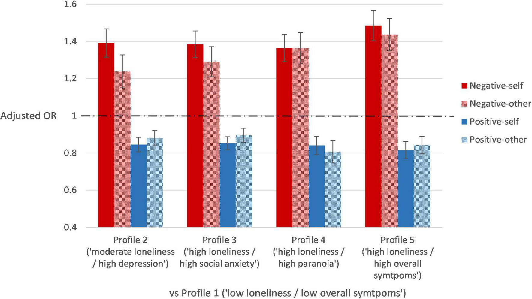 Five distinct profiles were identified. Profile 1 had low levels across all symptoms and dimensions of loneliness (n = 1,273, 60.9%). Profiles 2–5 were elevated on dimensions of loneliness, and were heightened in depression (n = 189, 9.0%), social anxiety (n = 206, 9.9%), paranoia (n = 198, 9.5%), and all symptoms (n = 223, 10.7%), respectively. Relative to Profile 1, the other four profiles scored higher on negative-self (adjusted ORs = 1.36–1.49, ps < 0.001) and negative-other schemas (adjusted ORs = 1.24–1.44, ps < 0.001), and lower on positive-self (adjusted ORs = 0.82–0.85, ps < 0.001) and positive-other schemas (adjusted ORs = 0.81–0.90, ps < 0.001).