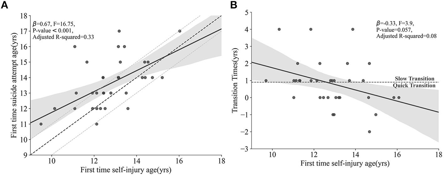 (A) The association between the onset age of NSSI and SA. The solid black line slowly approaches the diagonal dashed line in the figure, which is the line that fits the appearing NSSI and SA at the same age. (B) The association between the transition time from NSSI to SA and the onset age of NSSI. The area below the dashed line indicates the “Quick Transition” mode (time required from the onset of NSSI to SA was <1 year); the area above the dashed line indicates “Slow Transition” mode (time required from the onset of NSSI to SA is ≥1 year). NSSI, non-suicidal self-injury; SA, suicide attempt.