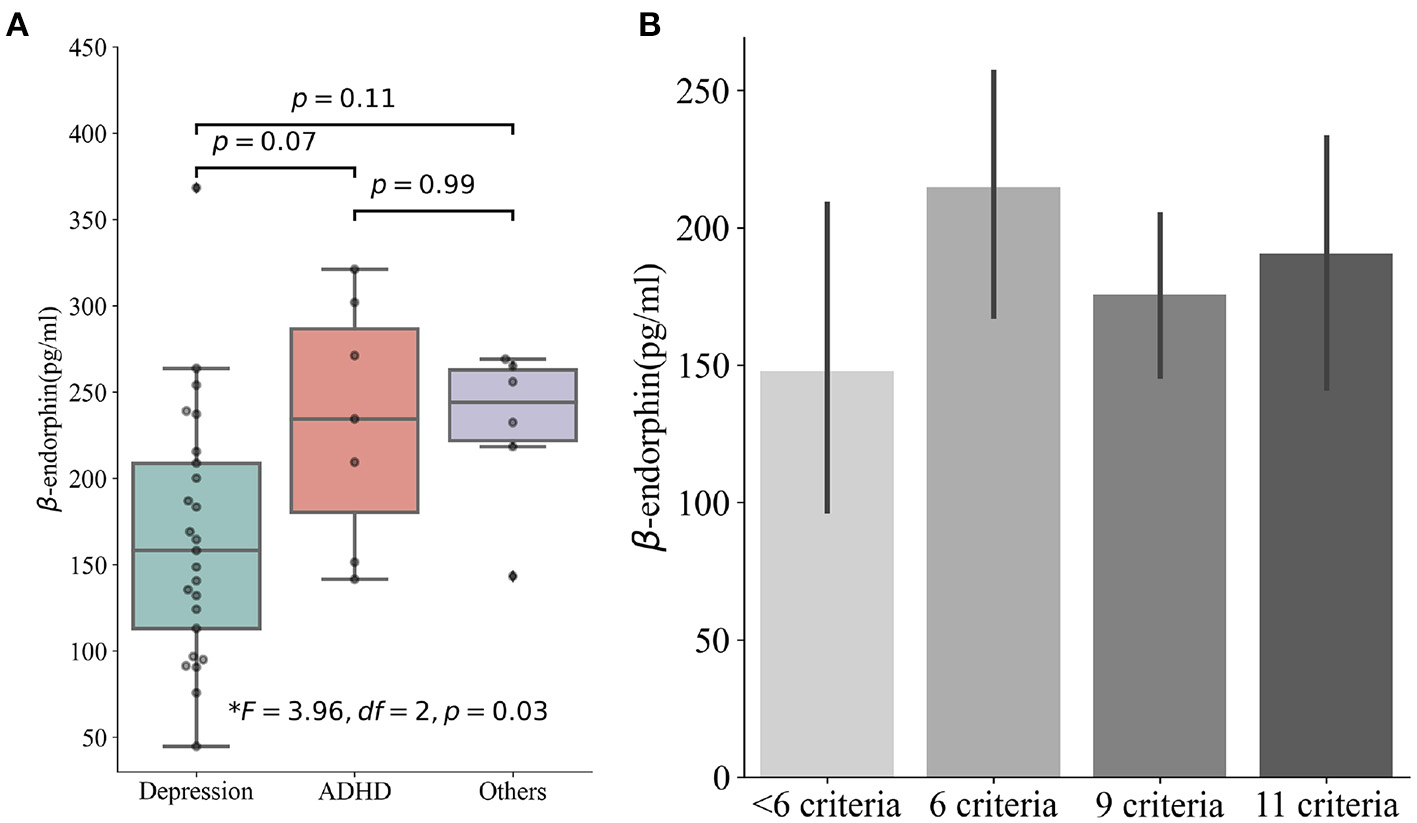 (A) Patients with different clinic diagnoses and their differences in serum beta-endorphins. (B) Patients met different SIB addiction criteria and their differences in serum beta-endorphins. SIB, self-injurious behavior.
