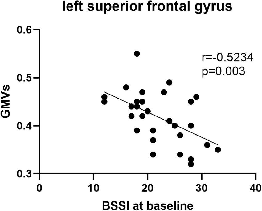 Negative correlations between the BSSI at baseline and GMVs in the left superior frontal gyrus (r = –0.5234, p = 0.003).