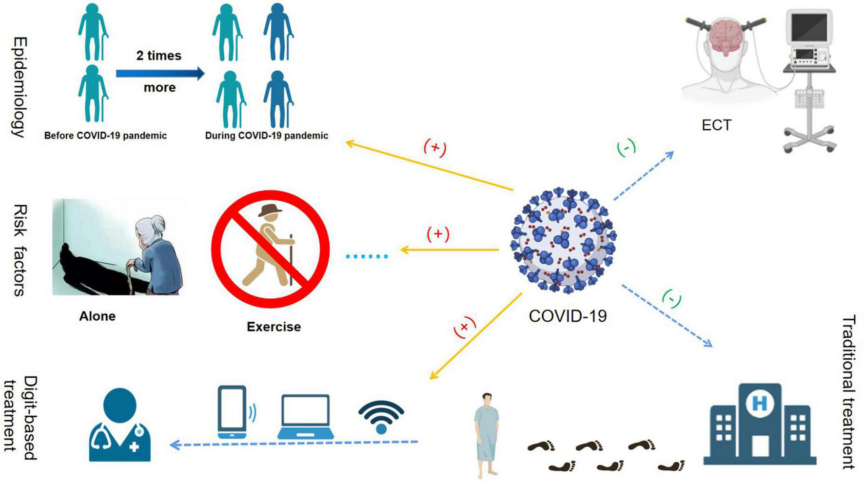 Figure 1. The effects of the COVID-19 pandemic on late-life depression (LLD). The COVID-19 pandemic increased the prevalence of LLD significantly. The prevalence of clinically significant depressive symptoms during the COVID-19 pandemic, which was more than two times higher than before the COVID-19 pandemic. The main risk factors associated with LLD during the COVID-19 pandemic were female sex, loneliness, poor sleep quality, and poor motor function. During the COVID-19 pandemic, owing to the possibility of virus transmission via bag-mask ventilation in the electroconvulsive therapy (ECT) procedure, many ECT units in hospitals worldwide were closed. During the COVID-19 pandemic, the conventional medical and healthcare service mode was “devastating,” while modern digital health intervention technology developed rapidly.