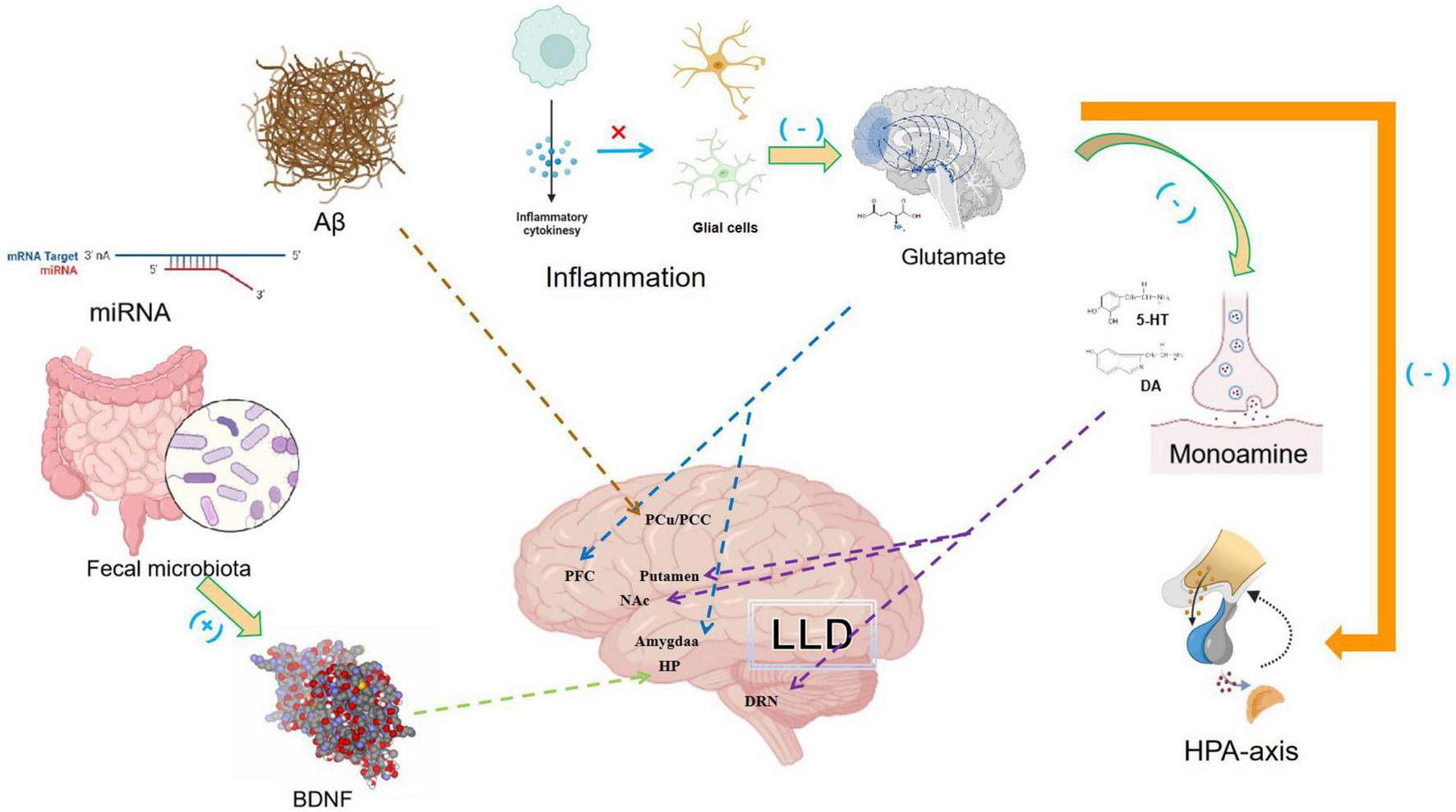 The pathogenesis of LLD is complex. Multiple etiological hypotheses have been proposed to explain the underlying biological mechanisms of LLD (Figure 2).