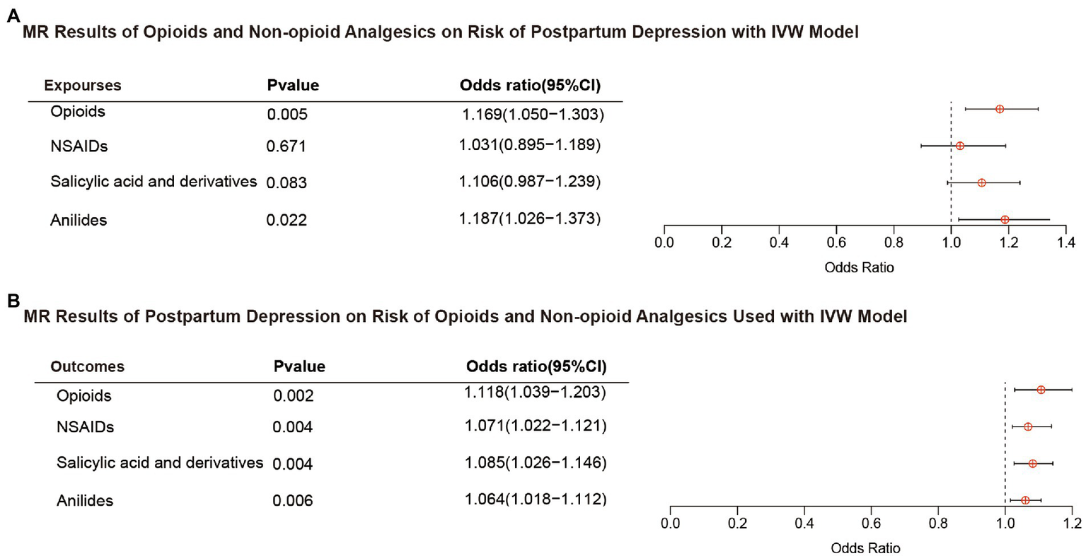 Results of bidirectional MR analysis with IVW model. (A) Opioids and non-opioid analgesics on risk of postpartum depression. (B) Postpartum depression on risk of opioids and non-opioid analgesics used. MR, mendelian randomization; IVW, inverse variance weighted; OR, odds ratio; and NSAIDs, nonsteroidal anti-inflammatory drugs.