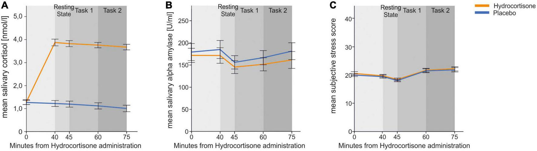 Physiological and subjective endocrinological and subjective response to hydrocortisone and placebo administration. Error bars represent 1 ± standard error of the mean (SEM). The first measurement was taken before tablet administration. (A) Mean cortisol (log-transformed in the figure only for presentiveness) (B) mean salivary alpha-amylase and (C) mean subjective stress responses measured by SERS for each time point.