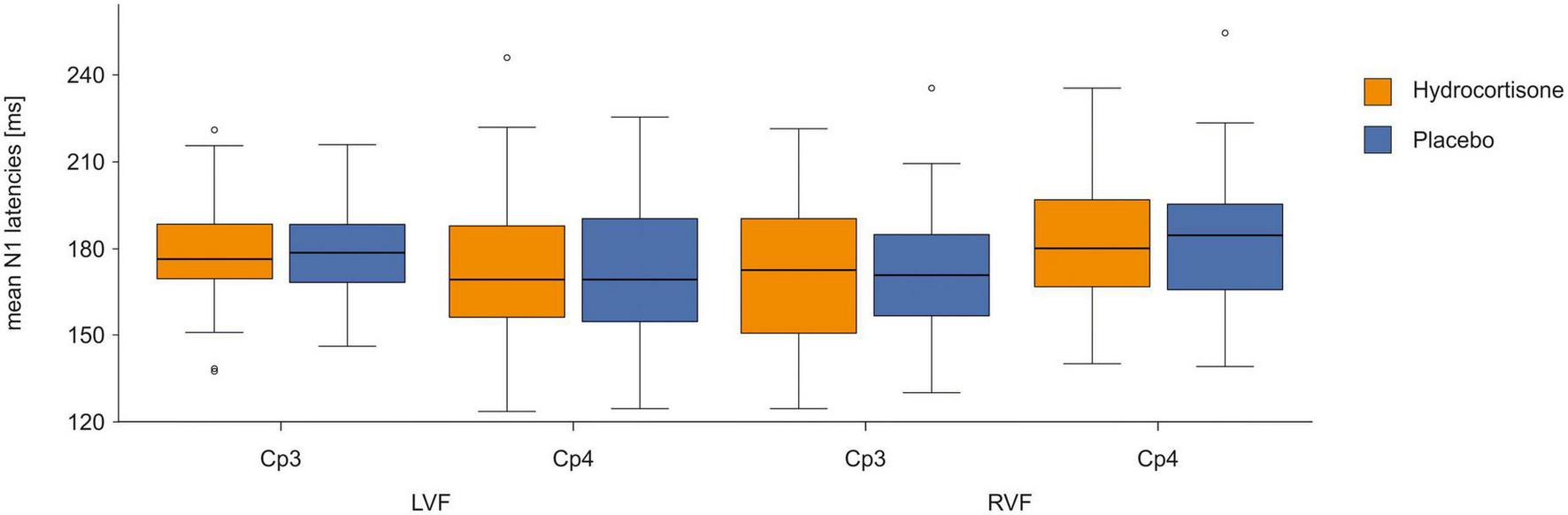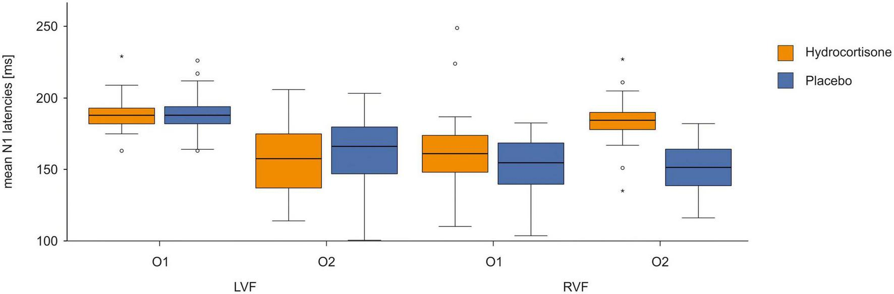 N1 latencies at the O1/O2 electrode pair after hydrocortisone and placebo administration.