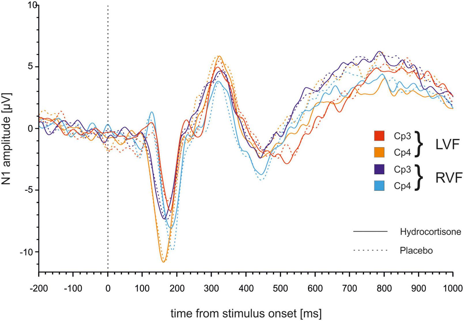 To investigate influences of hydrocortisone on transfer of lexical information in the LDT, we calculated repeated-measures ANOVAs with the factors treatment (hydrocortisone, placebo), visual field (LVF vs. RVF), hemisphere (left vs. right) and condition (word vs. non-word) for responses and reaction times of the behavioral LDT data. We performed the same analyses for EEG N1 latencies and amplitudes.