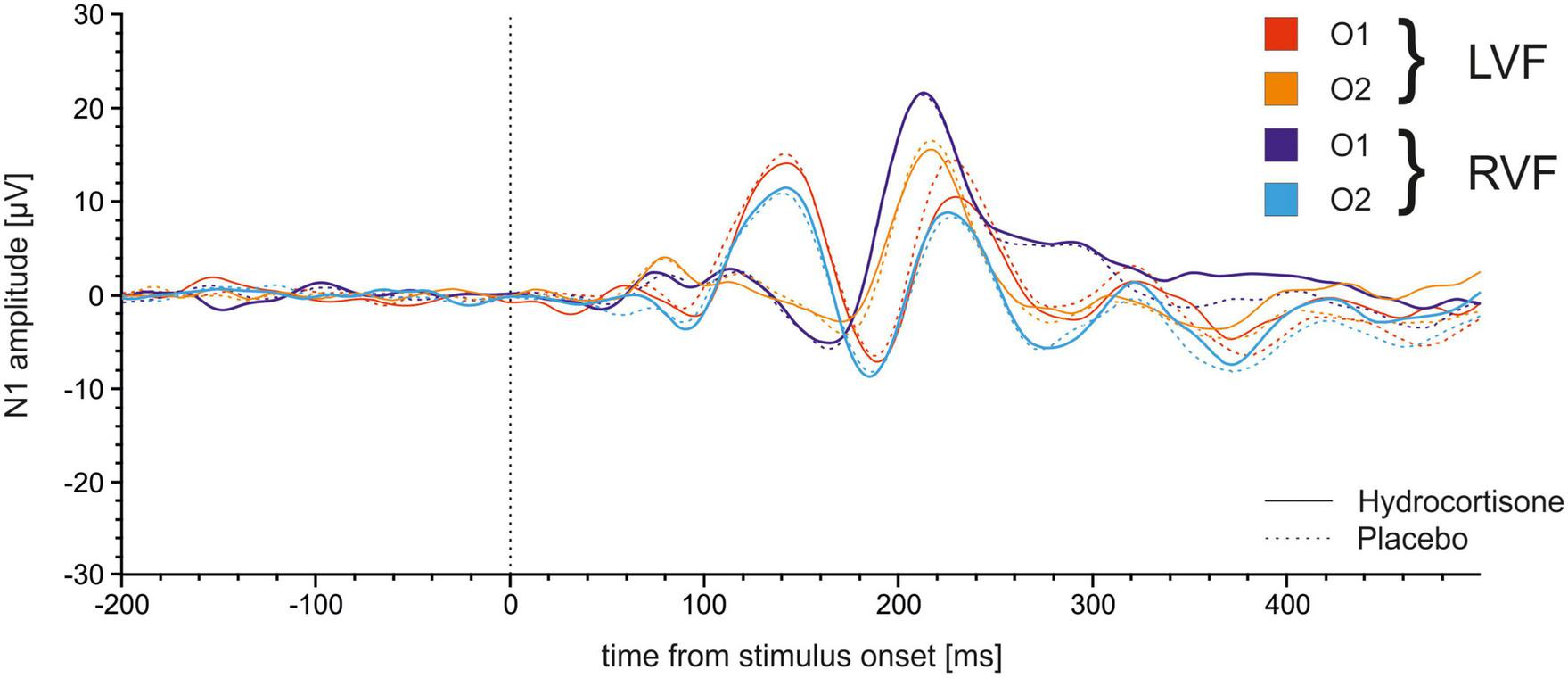 To determine any differences in ITT between the hydrocortisone and placebo treatment, we computed a repeated measures ANOVA with the factors treatment (hydrocortisone, placebo), visual half-field (LVF vs. RVF) and electrode (O1 vs. O2) as well as a dependent sample t-tests comparing the total transfer time between sessions. All post-hoc tests were Bonferroni corrected.